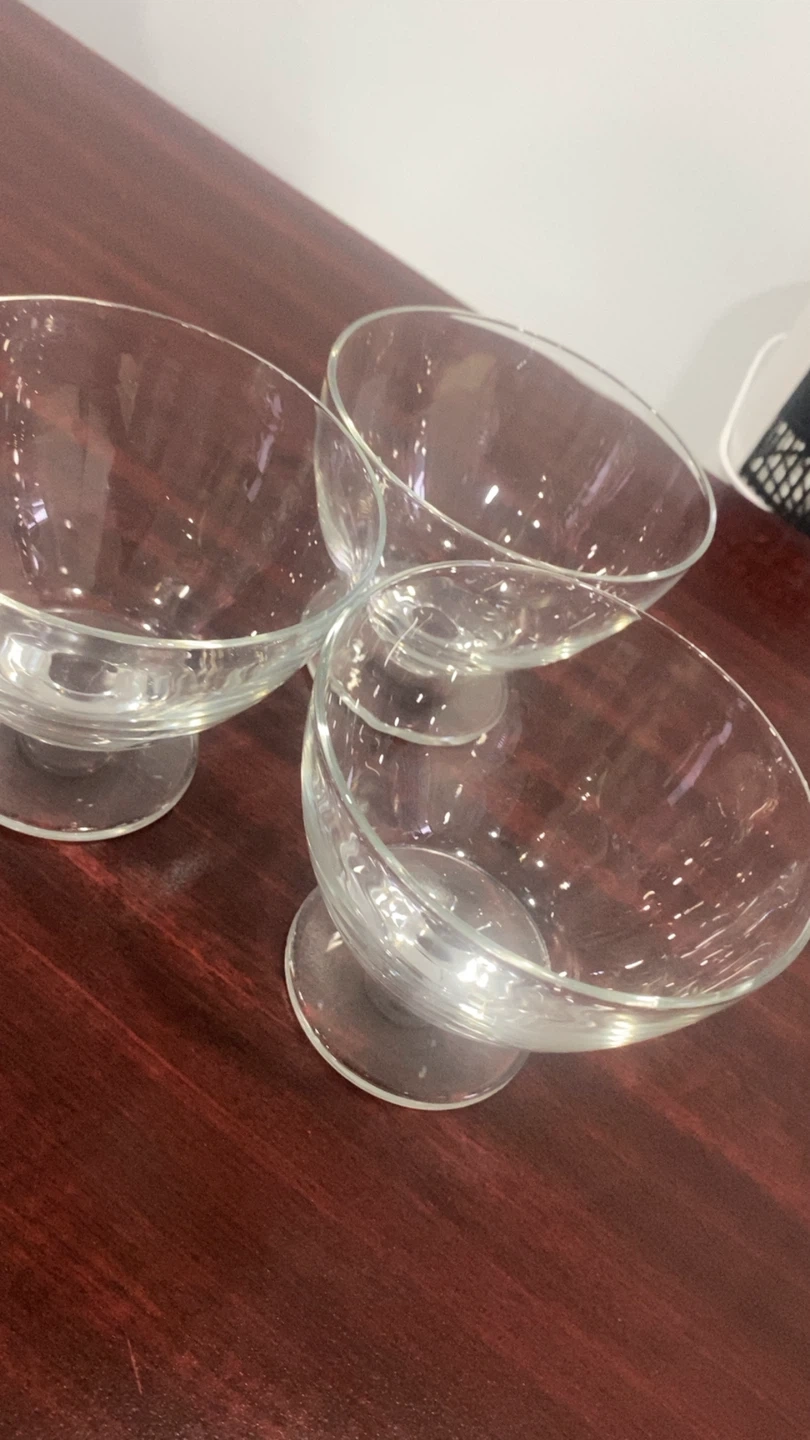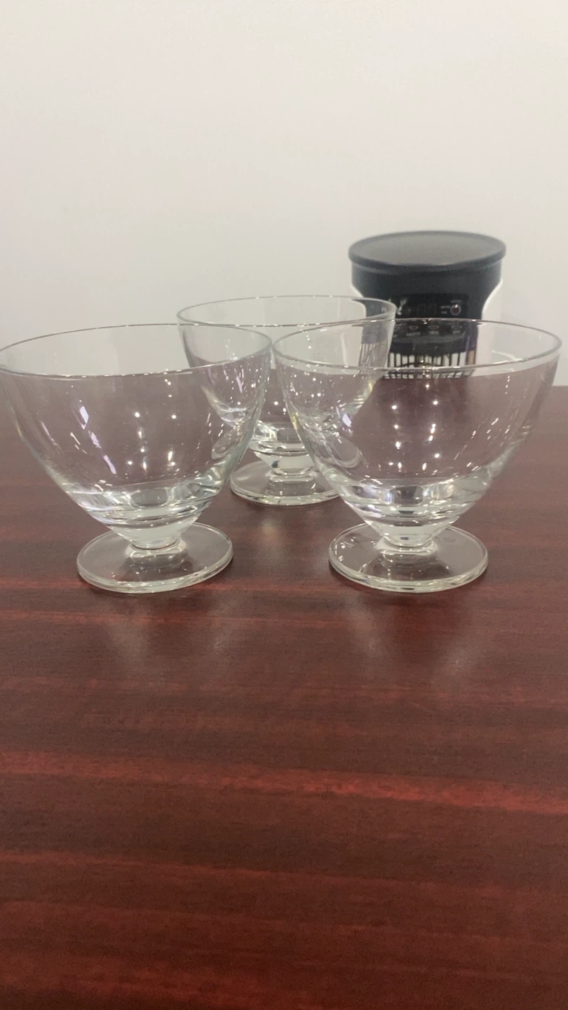 Selling a set of three clear glass dessert bowls. They're perfect for serving ice cream, pudding, or any sweet treat! They're in great shape and ready for a new home