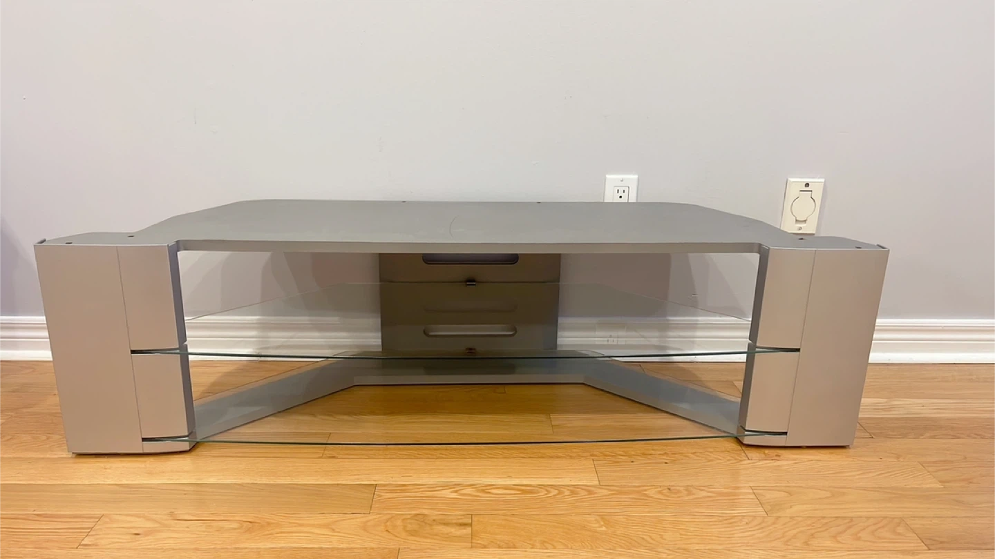 Selling a sturdy grey TV stand with glass shelves. It has a modern design and would look great in any living room. It also has a drawer for storage