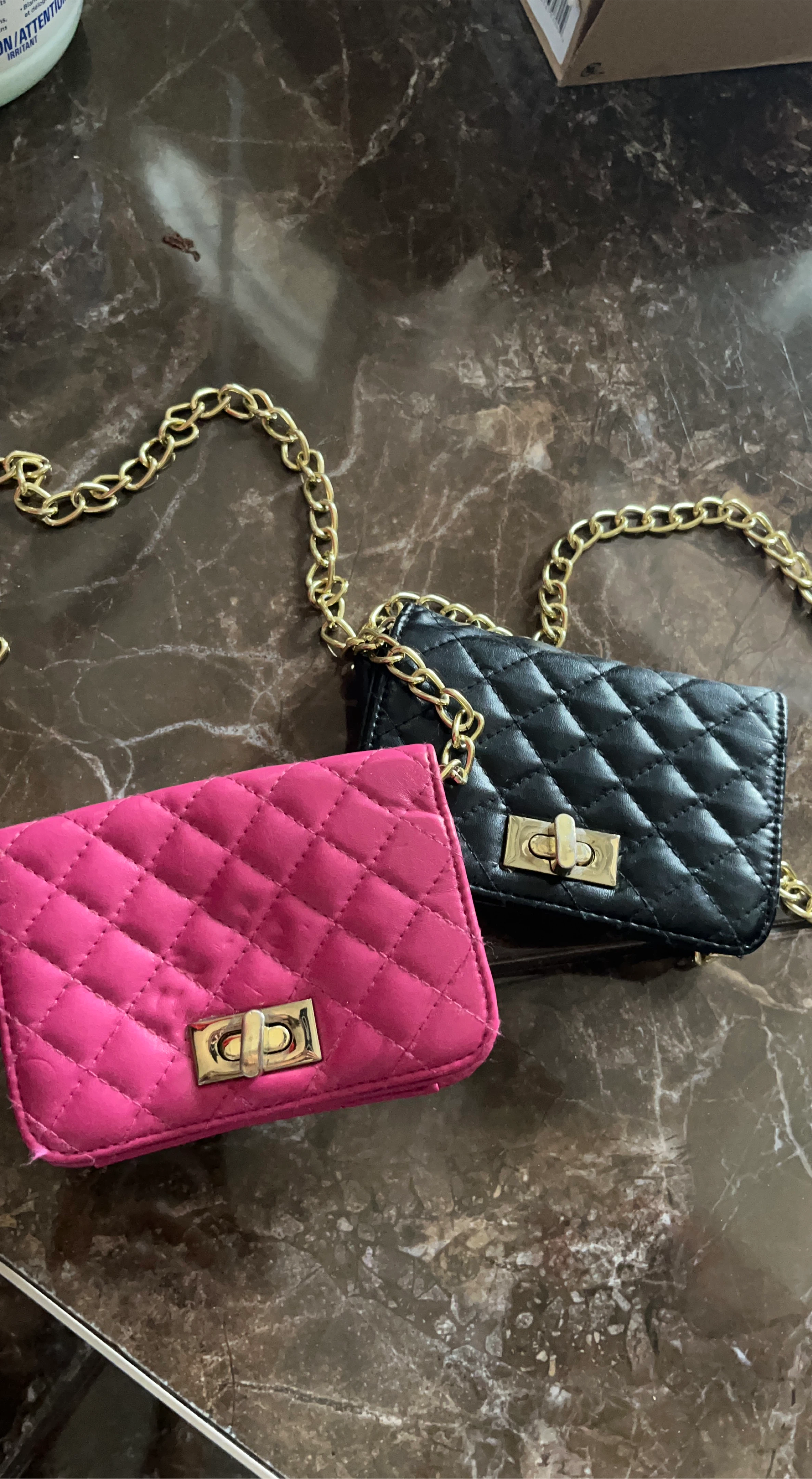 Selling two cute mini chain bags! One is a vibrant pink and the other is classic black. Both have a quilted design and gold-tone chain straps. They're perfect for adding a pop of colour or a touch of elegance to any outfit