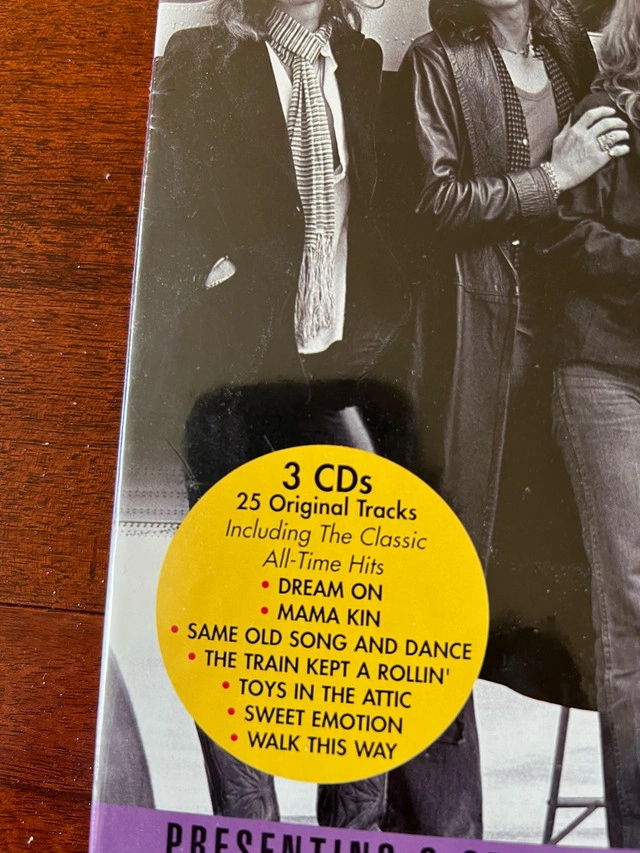 Relive the timeless rock of Aerosmith with "The Collection," a new three-CD set featuring 25 original tracks, including classics like "Dream On," "Mama Kin," and "Walk This Way." Tracklist: * Make It * Somebody * Dream On * One Way Street * Mama Kin * Write Me a Letter * Movin' Out * Walkin' the Dog * Same Old Song and Dance * Lord of the Thighs * Woman of the World * S.O.S. (Too Bad) * Train Kept A Rollin' * Seasons of Wither * Pandora's Box * Toys in the Attic * Uncle Salty * Adam's Apple * Walk This Way * Big Ten Inch Record * Sweet Emotion * No More No More * Round and Round * You See Me Crying Package is sealed in shrink wrap. If the ad is up, the item is available.