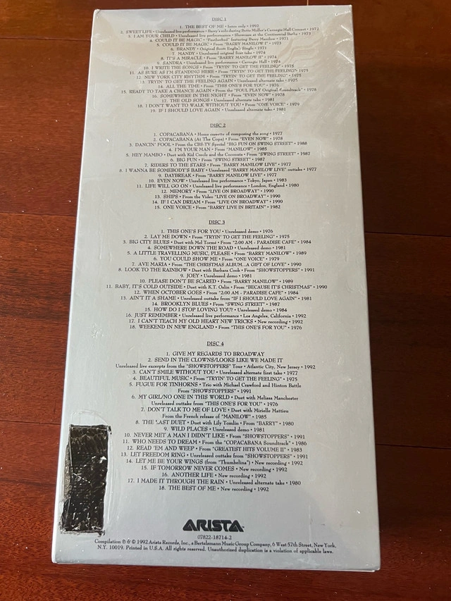 Unopened and factory sealed, this Barry Manilow box set, "The Complete Collection and Then Some..." from 1992, features an extensive compilation of his greatest hits and rare tracks. Key features include: * Comprehensive collection spanning Manilow's career * Rare and unreleased tracks included * Original packaging, unopened and sealed This collector's item is in pristine condition. It would make a perfect gift for any fan of Barry Manilow. Prices of similar box sets vary from $40-$100 depending on condition. Because this is sealed, I have priced it accordingly. Of course, if the ad is up, it's still available!