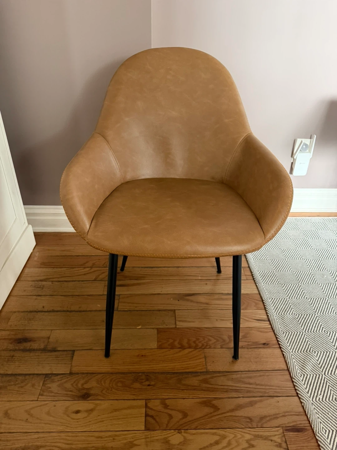 Selling a tan leather accent chair with black metal legs. It's in great condition and would look great in any room! The chair is made of leather and has a comfortable seat.