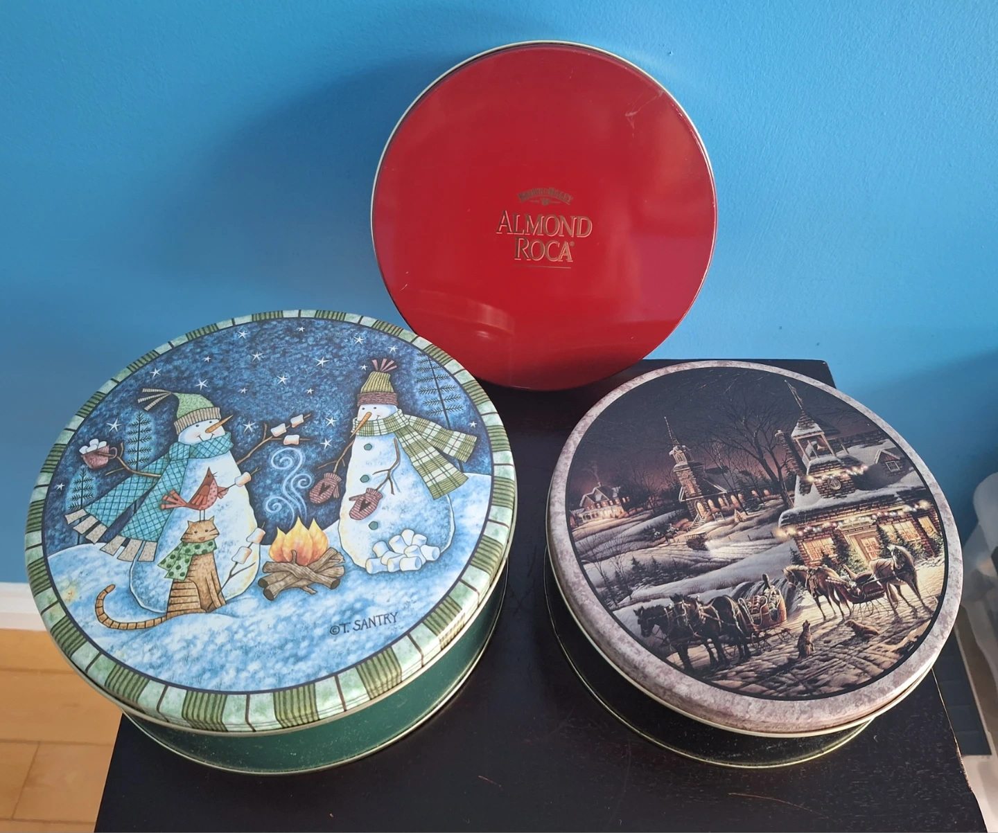 79Selling a set of decorative tins. There's an Almond Roca tin and two tins with winter scenes, one by T. Santry.
