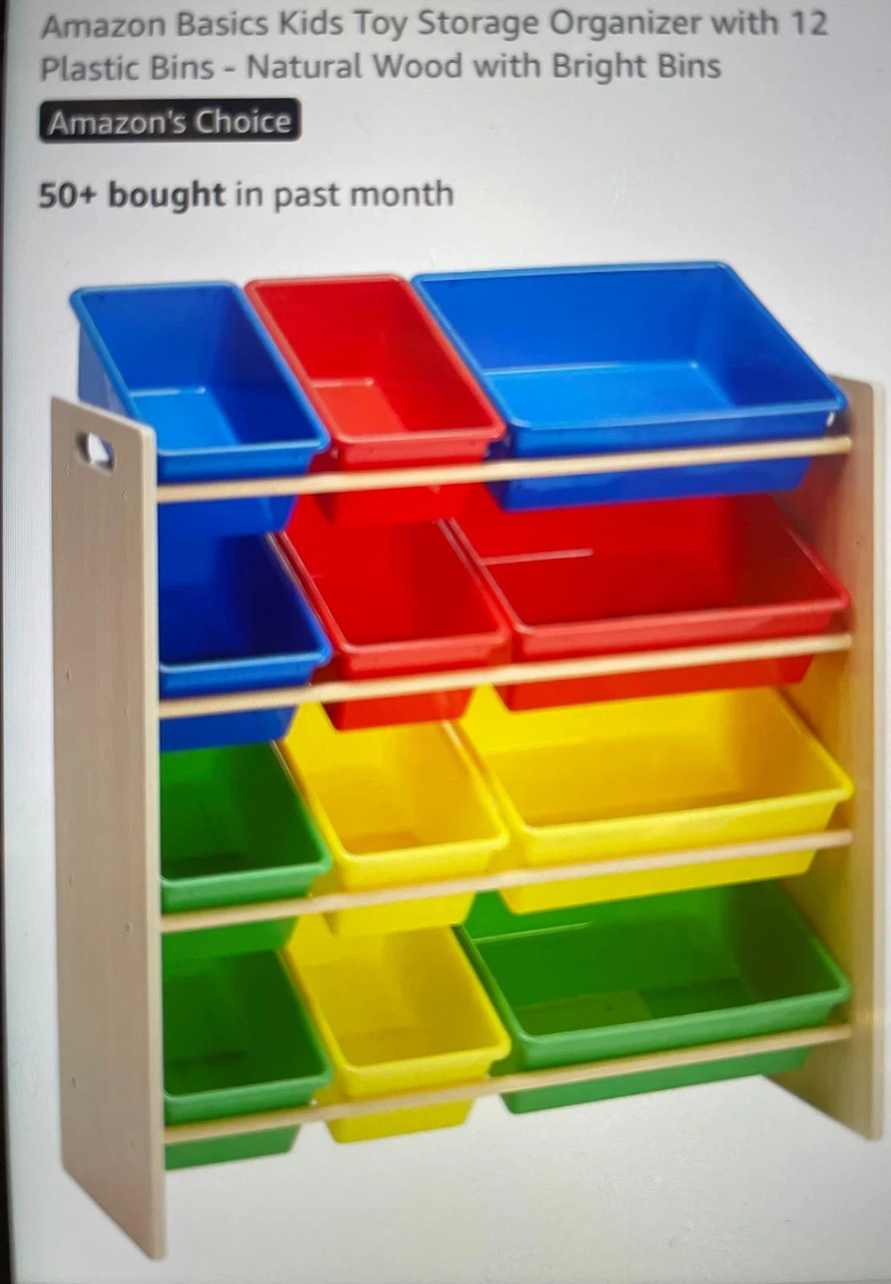 Selling an Amazon Basics kids toy storage organizer with 12 plastic bins! It features natural wood and bright bins to keep your little one's toys organized and tidy