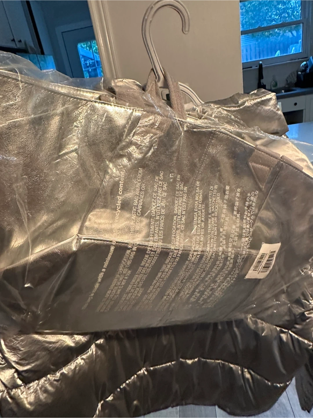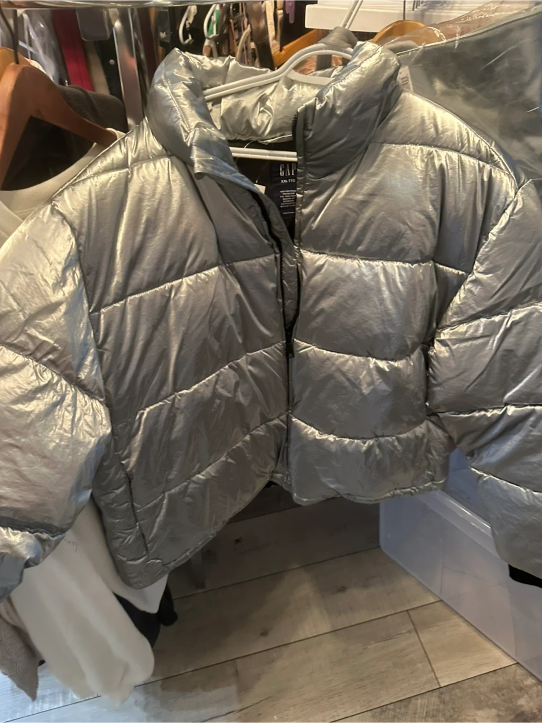 Selling a brand new GAP metallic silver puffer jacket in size XXL. It's 100% recycled polyester filled lining. Originally bought for $208. Comes with the original packaging!