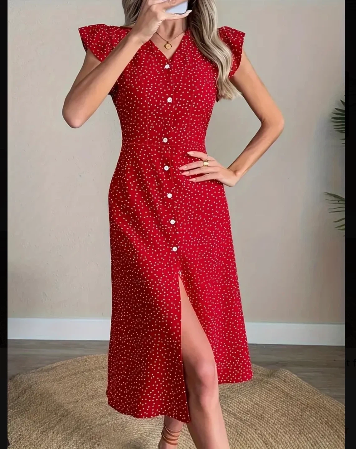 A cute red midi dress with a polka dot pattern. Perfect for a sunny day out or a casual event. It features a V-neck and button-down front. (Brand new in package)