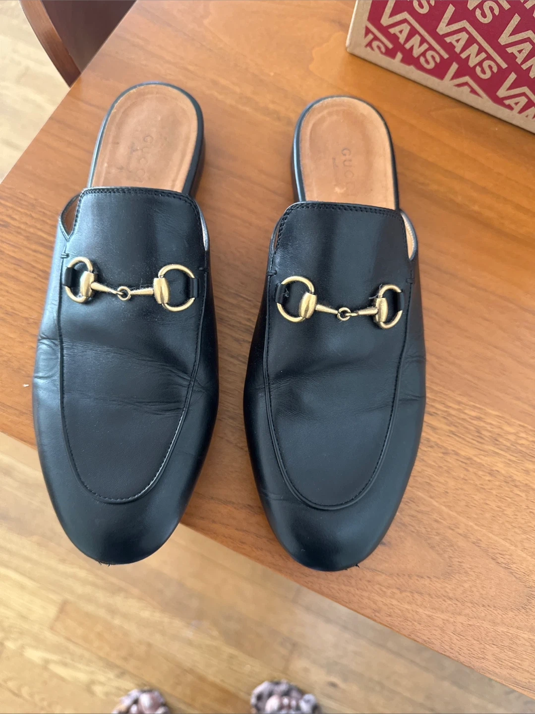 Selling a pair of Gucci black leather mules. They are size 37.5. Please see photos for condition!