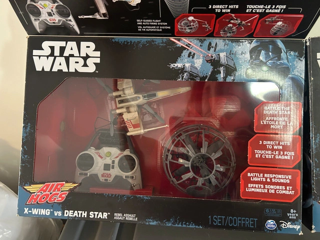 Get ready to recreate epic battles with this Star Wars Air Hogs X-Wing vs Death Star set, designed for ages 8 and up! The set includes everything needed for intense aerial duels. The X-Wing battles the Death Star by firing upon it to try and take it down. These are new in the box.