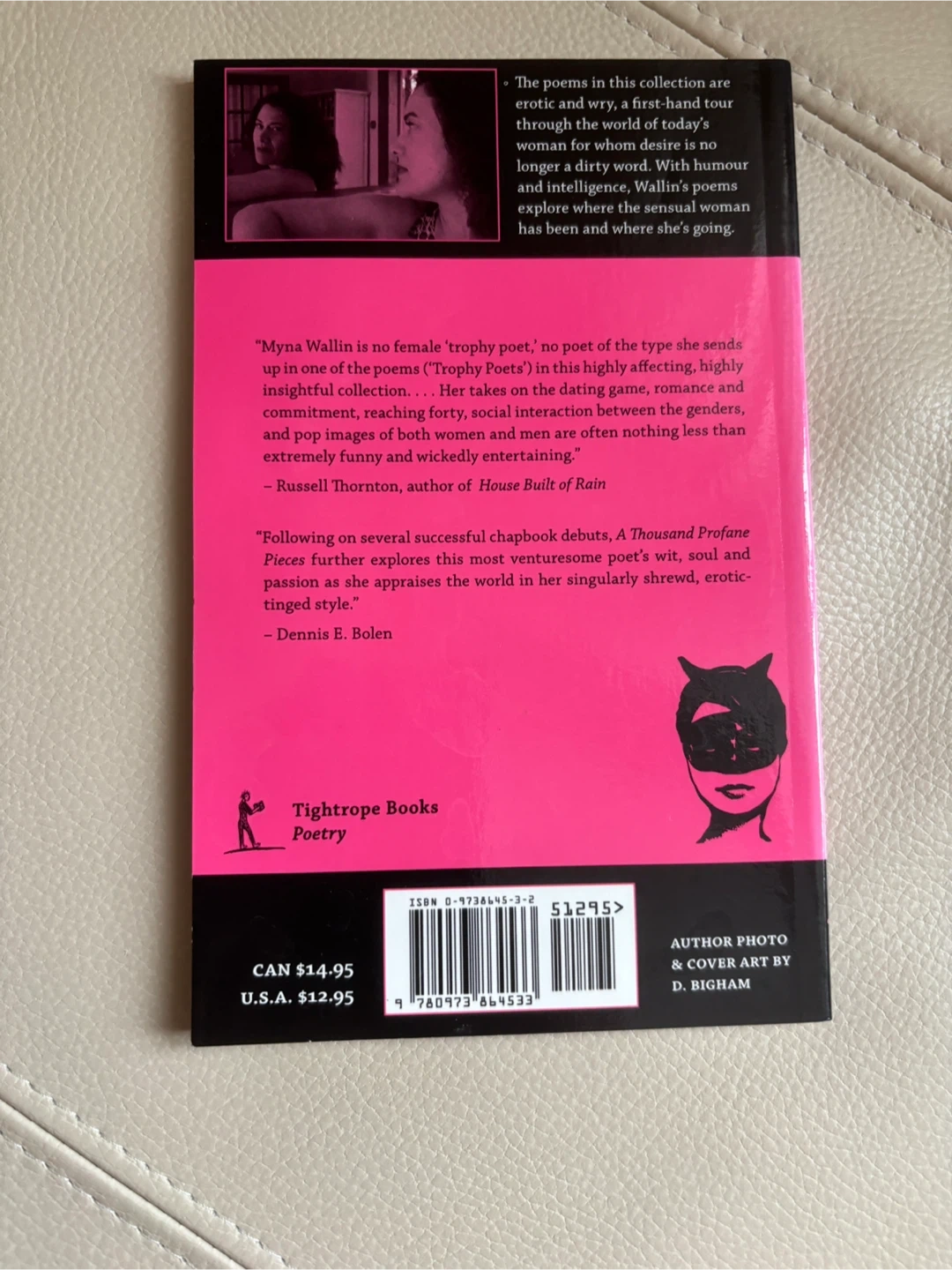 Selling a copy of "A Thousand Profane Pieces" by Myna Wallin. It's a poetry collection published by Tightrope Books. This book explores themes of desire, dating, romance, and social interaction with humour and intelligence. A great read for anyone interested in contemporary poetry!