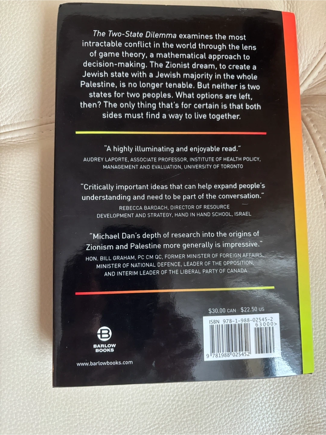 979Selling 'The Two-State Dilemma: A Game Theory Perspective on the Israeli-Palestinian Conflict' by Michael Dan. The book examines the conflict through the lens of game theory, offering a mathematical approach to decision-making. The back cover states it was originally priced at $30.00 CAD. Hard copy in great condition. From a SF and PF home. Pickup only in the St Lawrence market area of downtown Toronto. Cash only.