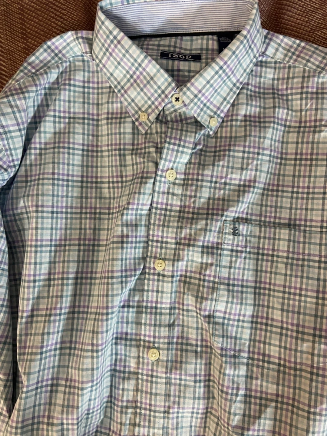 Here's a unused IZOD plaid button-down shirt. It features a classic plaid pattern in shades of blue, grey, and purple. Perfect for a casual yet stylish look!