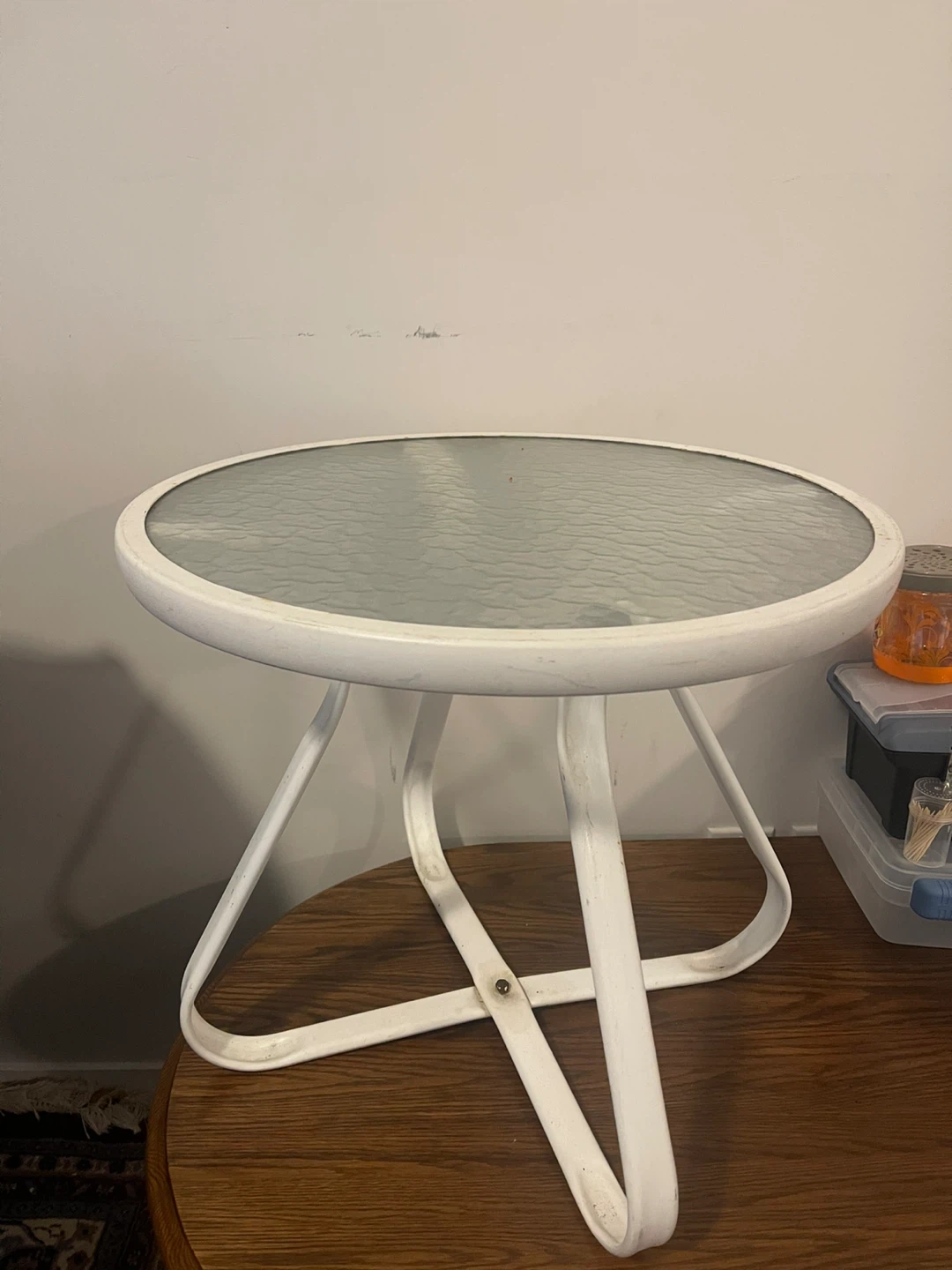 Buy & SellWhite Round Glass Top Side TableWhite Round Glass Top Side Table$10Selling a cute little side table with a round glass top! It has a white frame and is perfect for a small space or as an accent piece in any roomConditionLike newWHERE TO MEET226 Speckled Alder RowView MapSELLERverifiedJedidiahBarrhaven793 reviews0 chats·0 favorites·6 viewsSEND CHAT TO SELLERHi Jedidiah! I’m interested in your listing.Hi Jedidiah! I’m interested in your listing.Get the Karrot app to chatSign In to chat