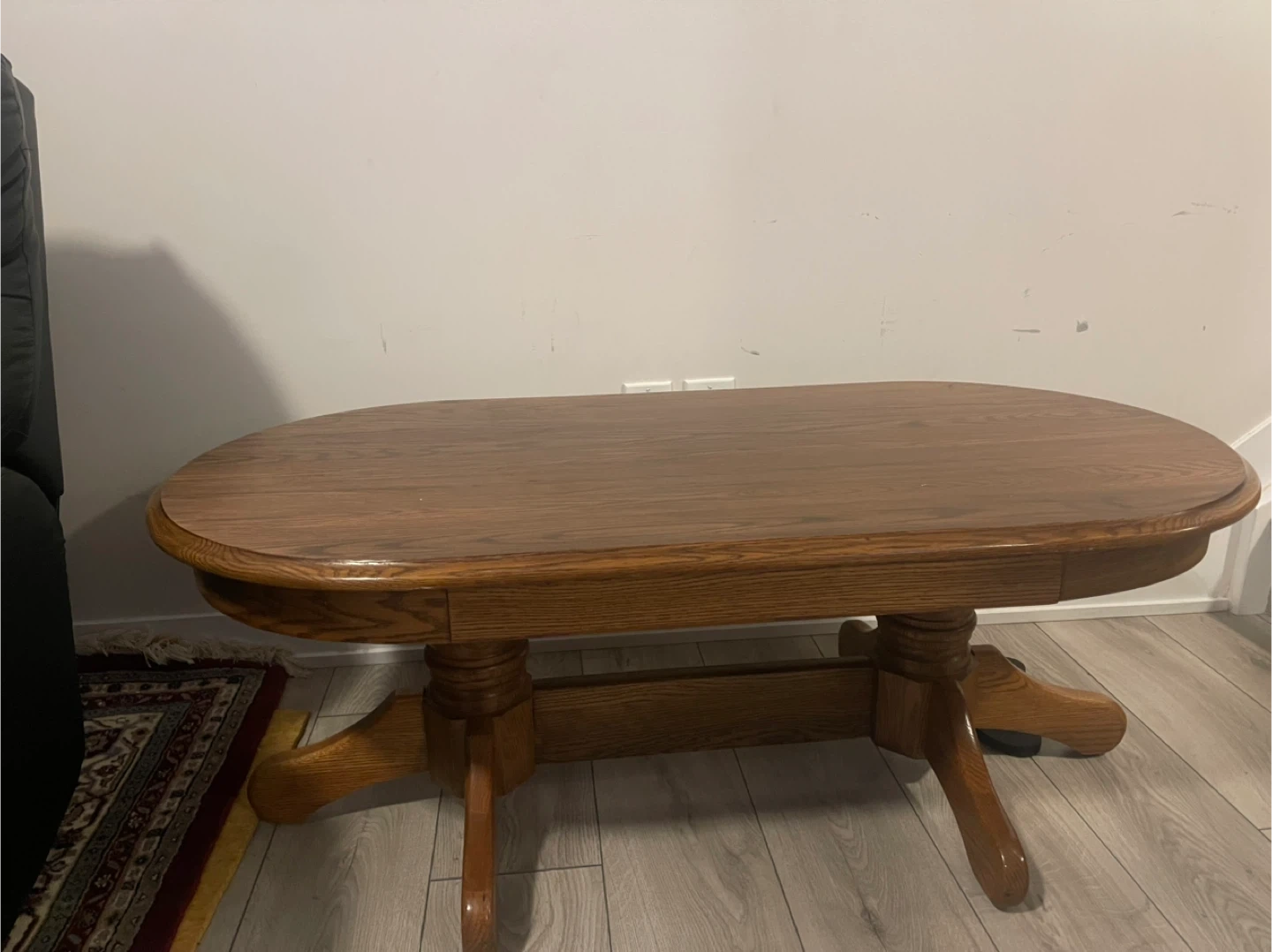Selling a vintage wooden oval coffee table. It's a lovely piece with a classic design that would fit well in many living rooms. The table is sturdy and has a beautiful wood grain finish. It's in good condition, ready to be a centrepiece in your home!