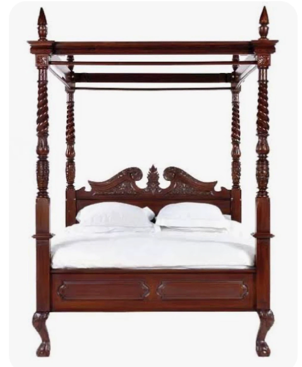 Selling a beautiful, Queen Anne antique-style four-poster bed. It's made of solid mahogany with intricate detailing on the headboard and posts. Perfect for adding a touch of elegance to your bedroom!