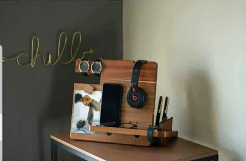 WUTCRFT - Wood Docking Station/Nightstand Organizer with Headphone Stand, Smart Watch Charging Slot, Photo Holder, and Accessory Holder, Perfect for Desk Organizer/Gifts for Men