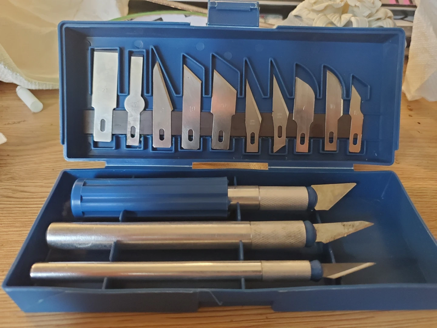 Selling a craft knife set that includes 10 extra blades (13 in total) and 3 handles. It comes in a blue plastic case to keep everything organized and safe. Perfect for hobby/crafting!