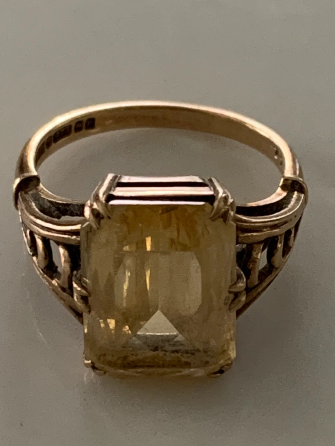 Selling a vintage ring featuring a beautiful yellow stone. It's a unique piece with intricate detailing on the band. Perfect for adding a touch of vintage charm to any outfit!
