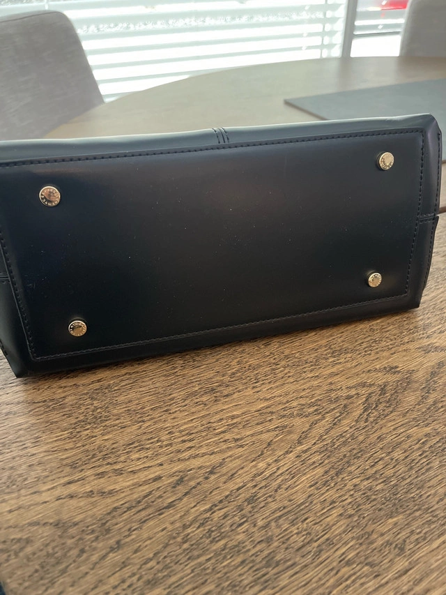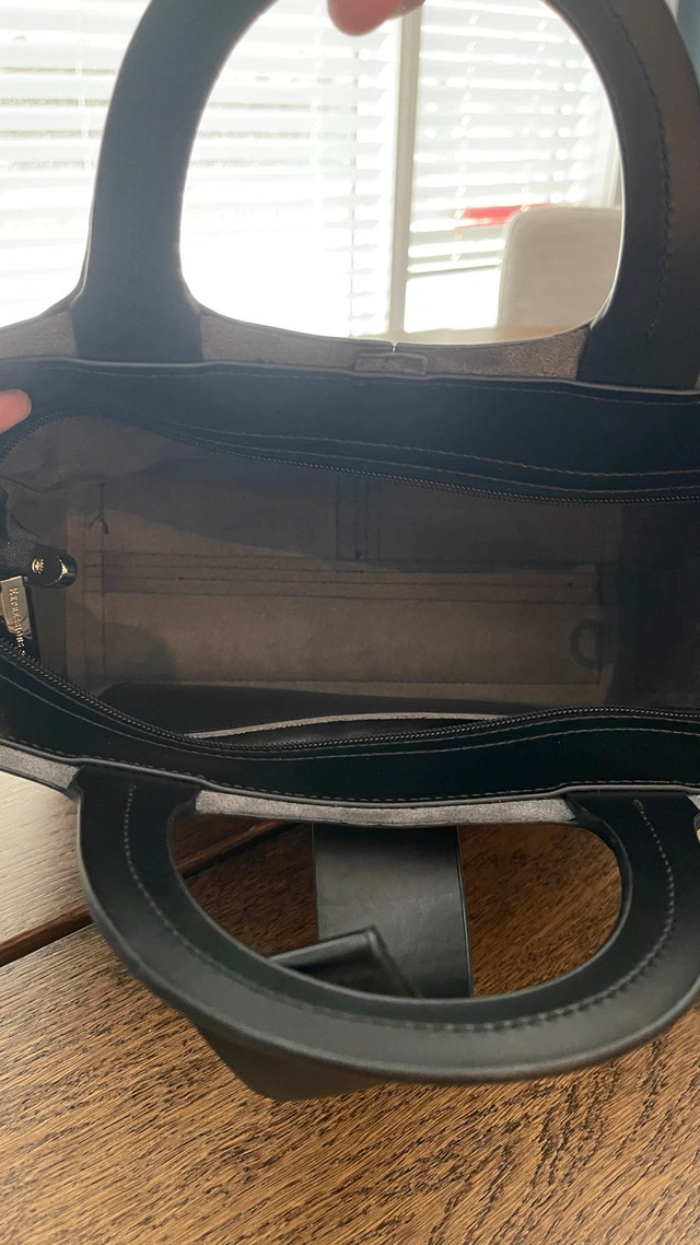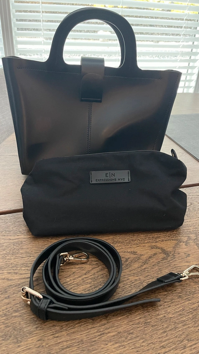 Check out this EXPRESSIONS NYC handbag, a stylish and practical accessory featuring a sleek black design with a top handle and a detachable shoulder strap. The bag includes a matching black pouch, perfect for keeping your essentials organized. The interior has a pocket. This handbag is in very good condition. Key features: * Colour: Black * Material: High-quality synthetic materials * Includes: Handbag, removable shoulder strap, and matching pouch. Let me know if you're interested!