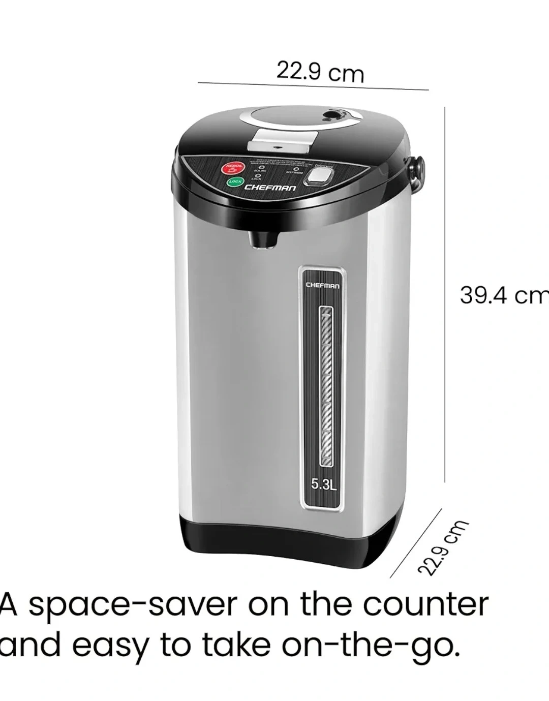 Keep your water hot and ready to go with this Chefman hot water pot! It holds up to 5.3L, making it perfect for gatherings or everyday use. It's designed as a space-saver on the counter and easy to take on-the-go
