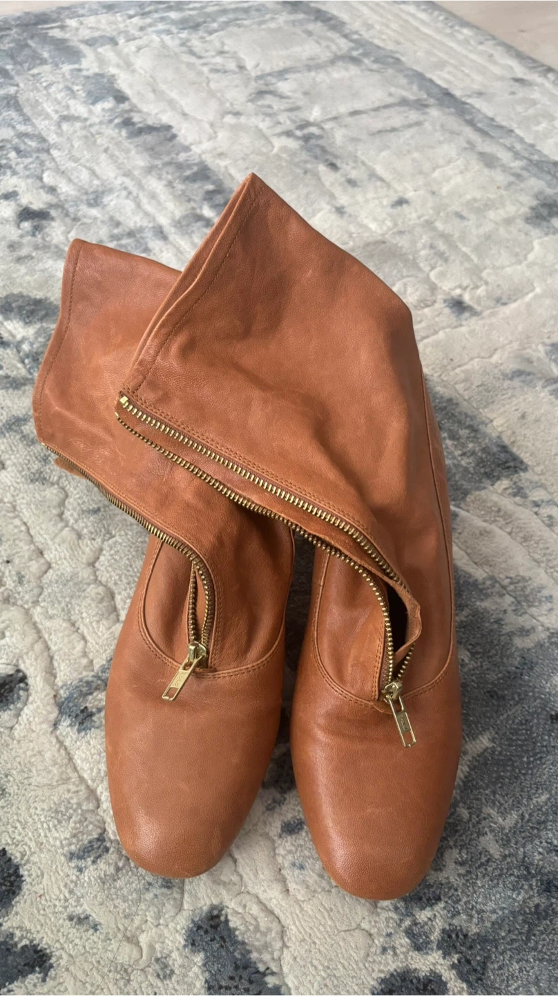 These stylish ankle boots are a lovely shade of brown and made of real leather. They feature a unique front zipper detail. Perfect for adding a touch of flair to any outfit!