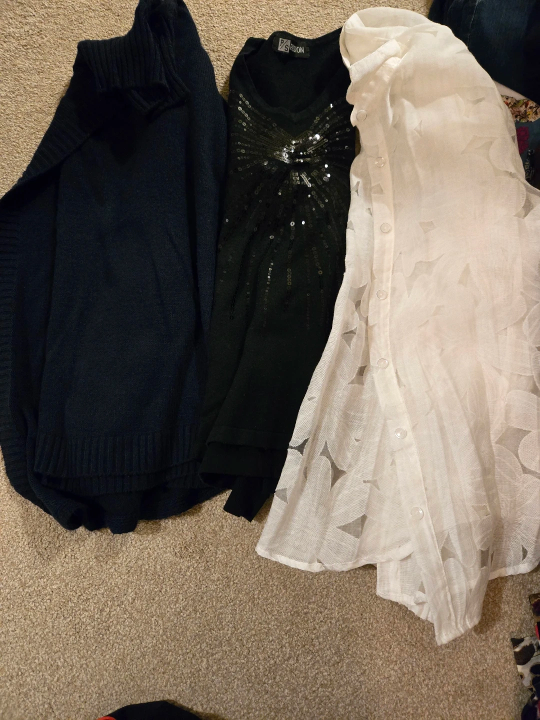 Selling a few assorted women's tops. There's a black cardigan-style sweater, a black long-sleeve top with sequins, and a white button-up top with a sheer, patterned fabric. All in great condition!