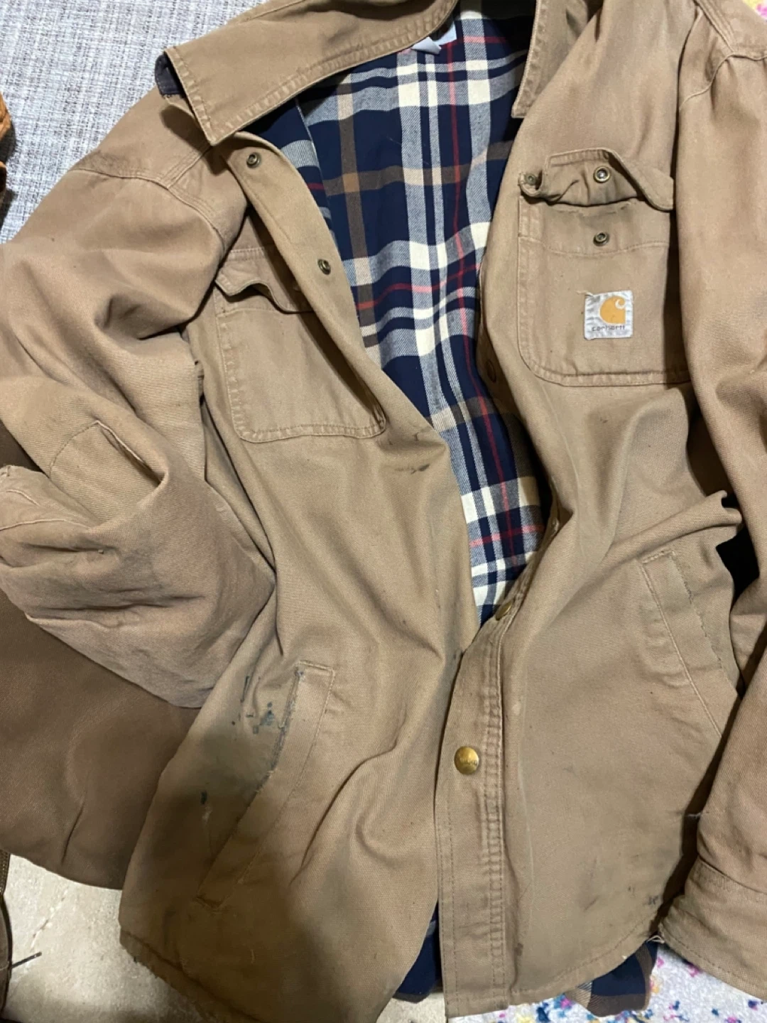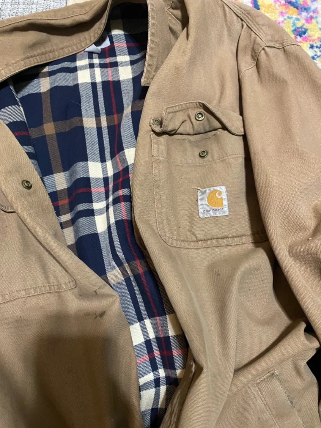 Selling a Carhartt workwear jacket in size medium. It's a brown colour with a plaid lining. There are some signs of wear, as shown in the photos, but it's still a great jacket for work or casual wear!
