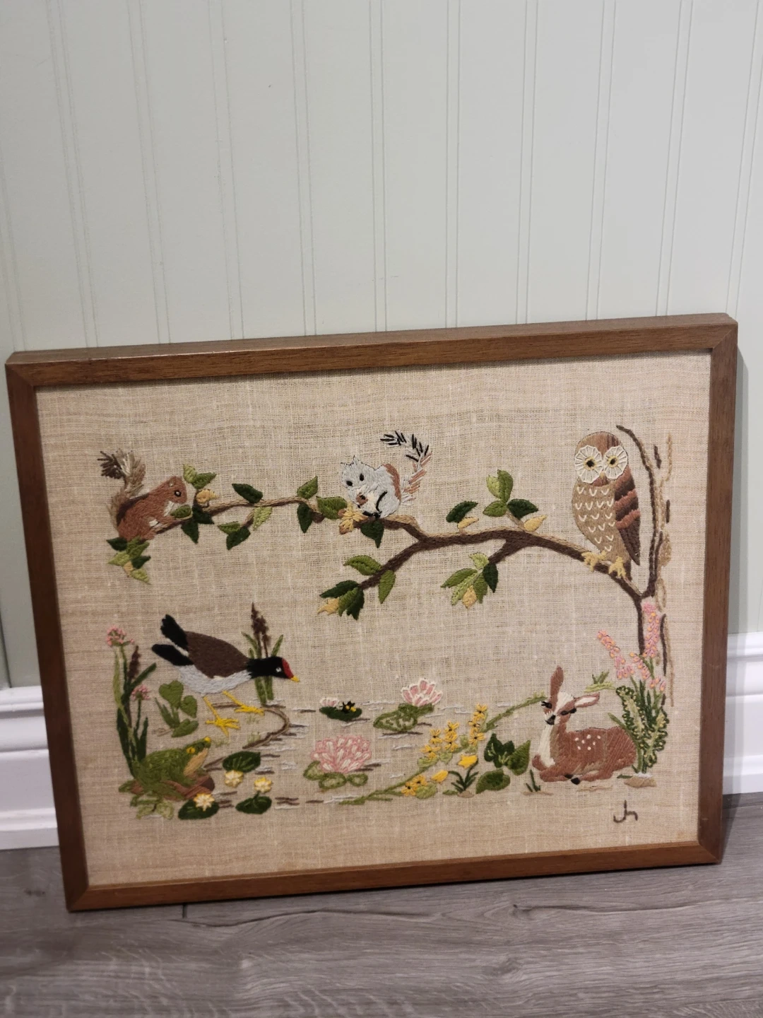 This used, Like New.framed Crewel Embroidered art piece showcases a charming woodland scene, complete baby deer with squirrel,chipmunk an owl, a frog and a duck amidst lily pads , flowers