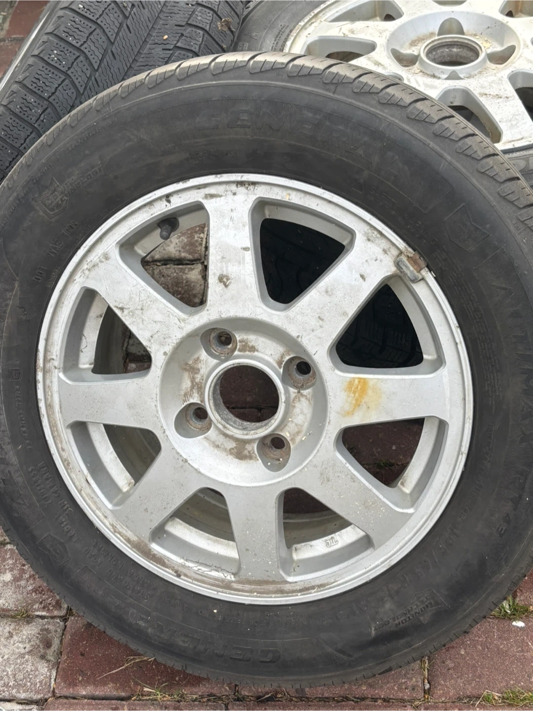 Selling a set of five tires mounted on rims. The tires are size 195/65R15. One tire is a Michelin, another is a General Altimax, and another is an X-ICE. Great for winter!