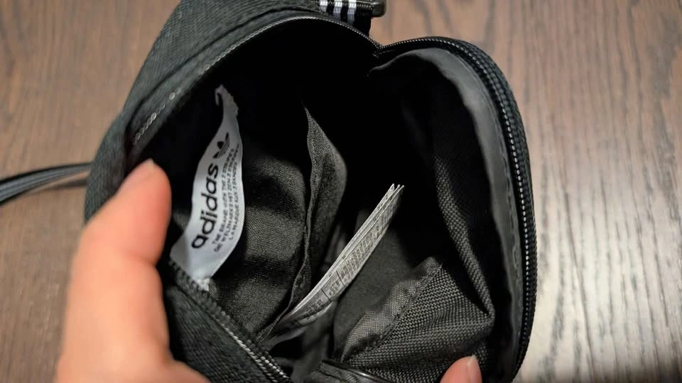 Comfortably fits phone, earbuds, wallet, and more. I can put a 20mah power bank, phone, cardholder, earbuds, and still have some room left. There's a fabric divider in the main compartment of the bag (pictured) and an external pocket.