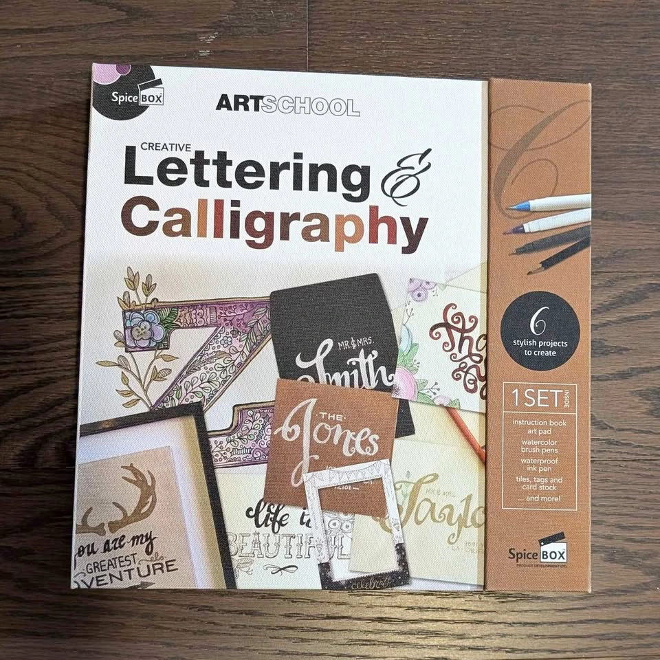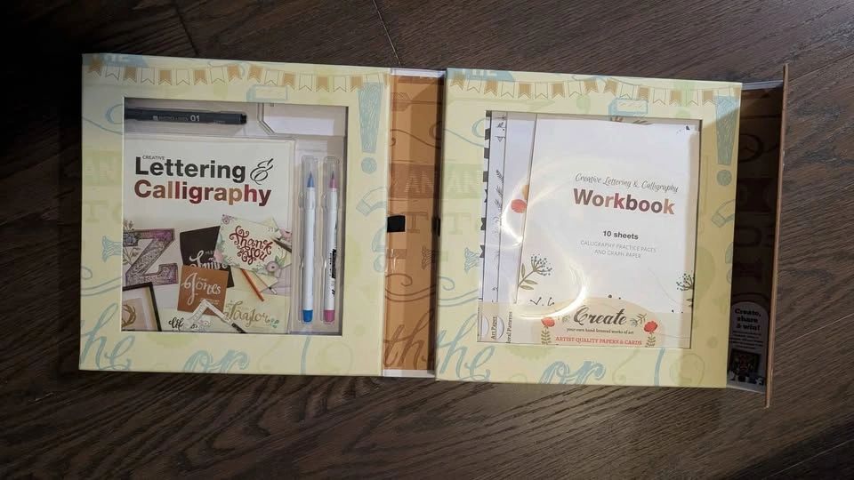 New unused lettering and calligraphy kit. Contains 3 brush pens, a microliner pen, instruction booklet, workbook, cards and tags. Bought for $55.