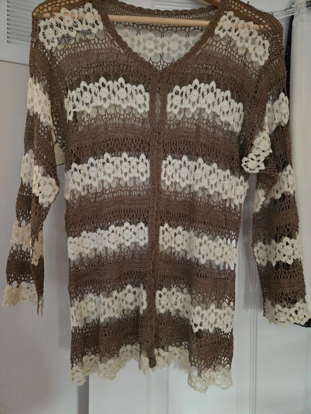 Selling a lovely crochet cardigan with brown and cream stripes! It's in great condition and perfect for layering. The open knit design is so unique and adds a touch of handmade charm to any outfit