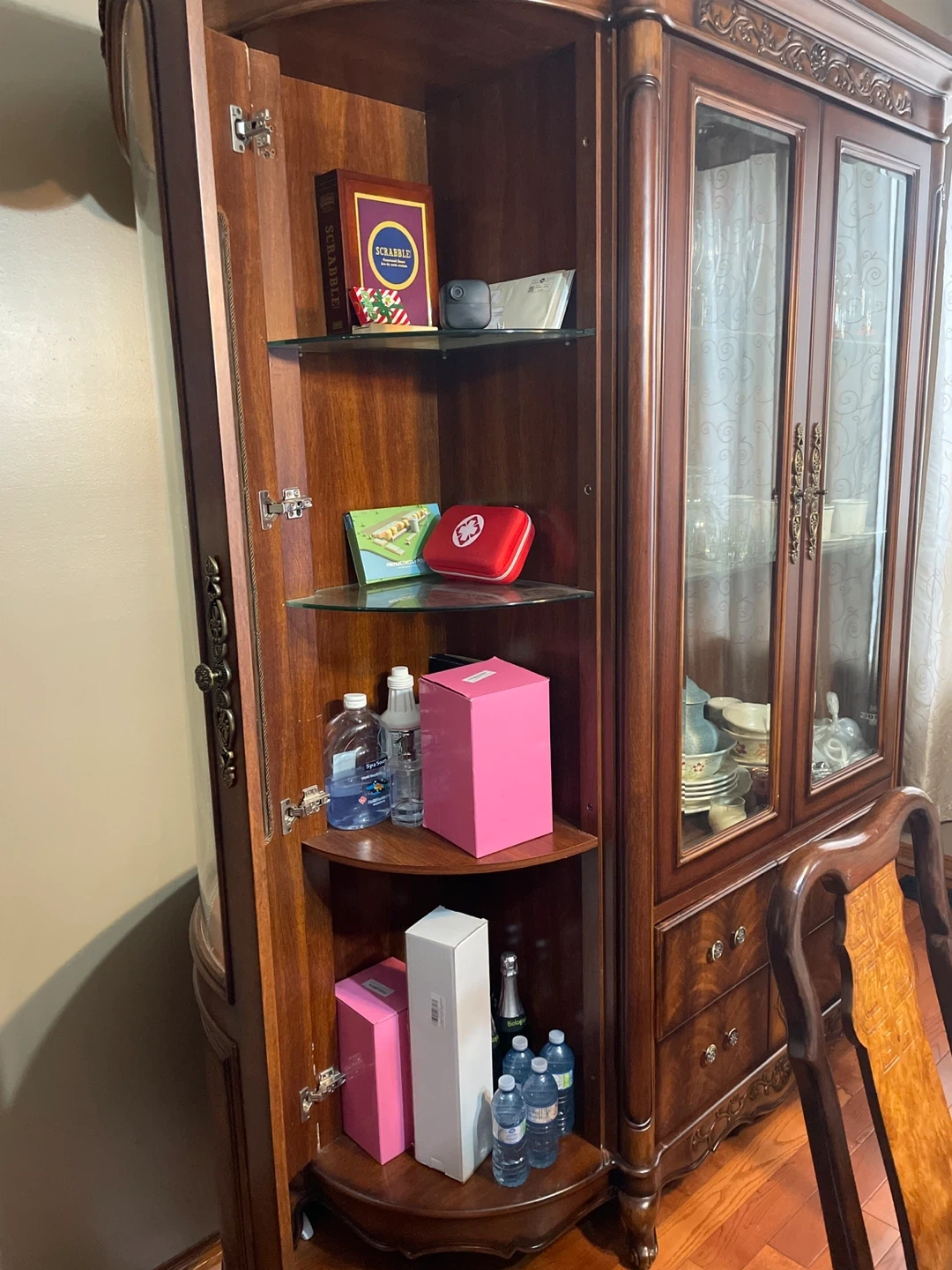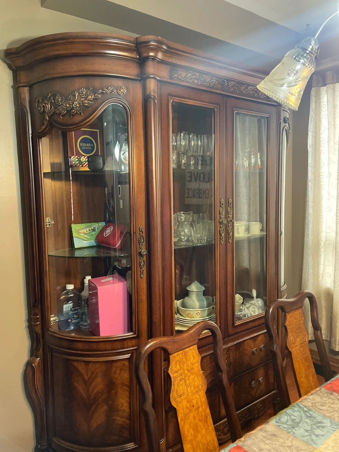 Selling a wooden china cabinet. It has glass doors and shelves, perfect for displaying your favourite dishes and glassware. It also has drawers for storage, and a switch light for display