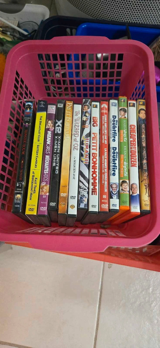 Selling a collection of 15 DVDs, featuring a mix of comedies, family films, and classics like 'The Wizard of Oz' and 'The Breakfast Club'. These DVDs have provided many hours of entertainment and are in used condition. Here's a list of the movies included:
