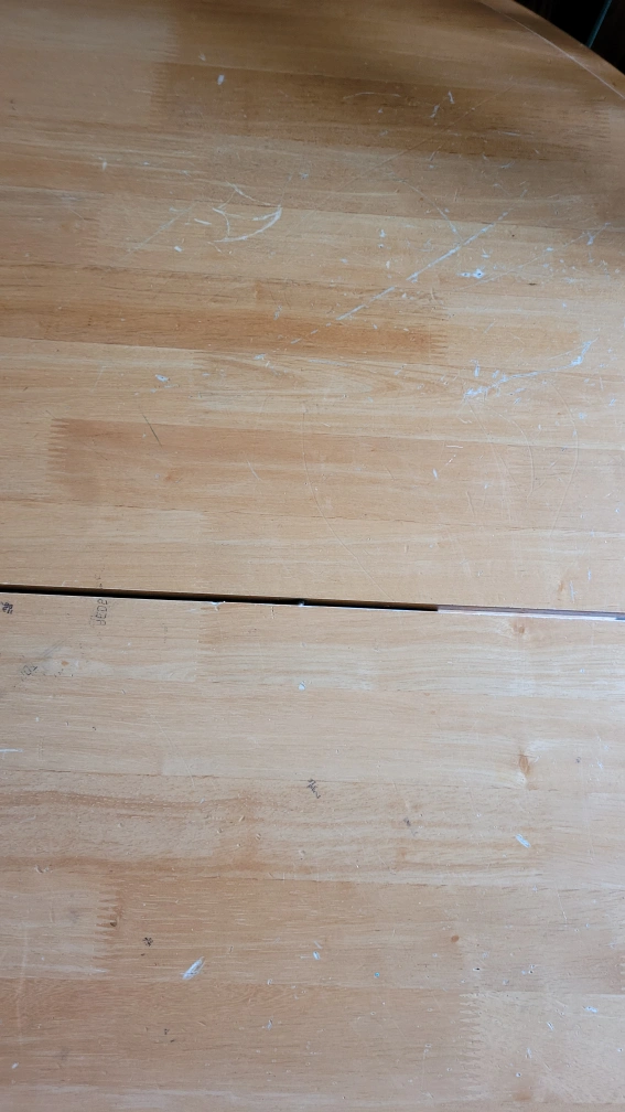 Selling a round wooden dining table with five chairs. The table has a light wood finish, and the chairs are painted green. I've had this well used table for over 10 years and doesn't quite close tight anymore but it still has plenty of life left, overall it's a sturdy and functional set!