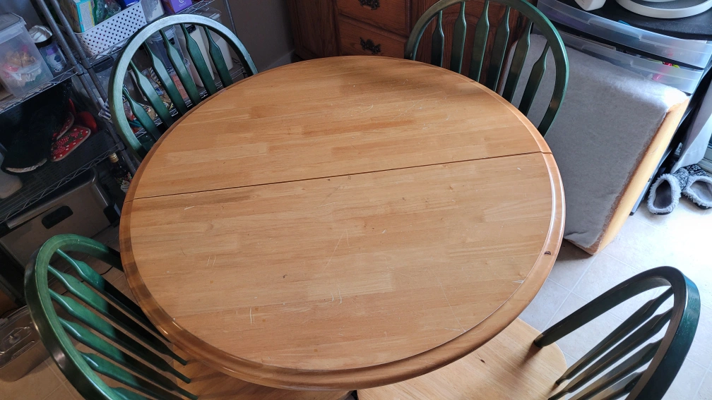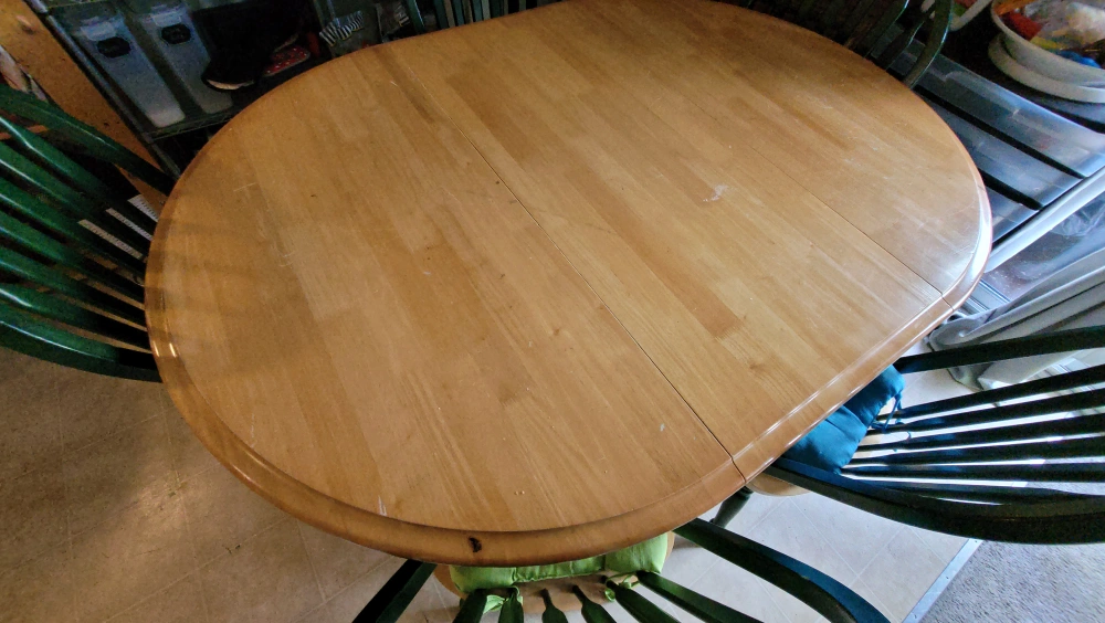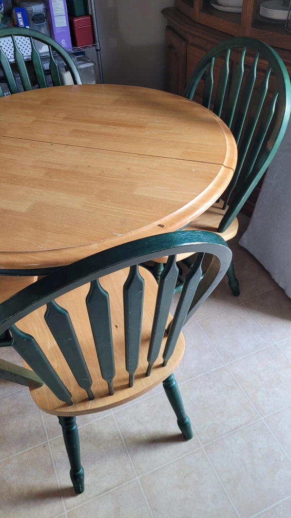 Selling a round wooden dining table with five chairs. The table has a light wood finish, and the chairs are painted green. I've had this well used table for over 10 years and doesn't quite close tight anymore but it still has plenty of life left, overall it's a sturdy and functional set!
