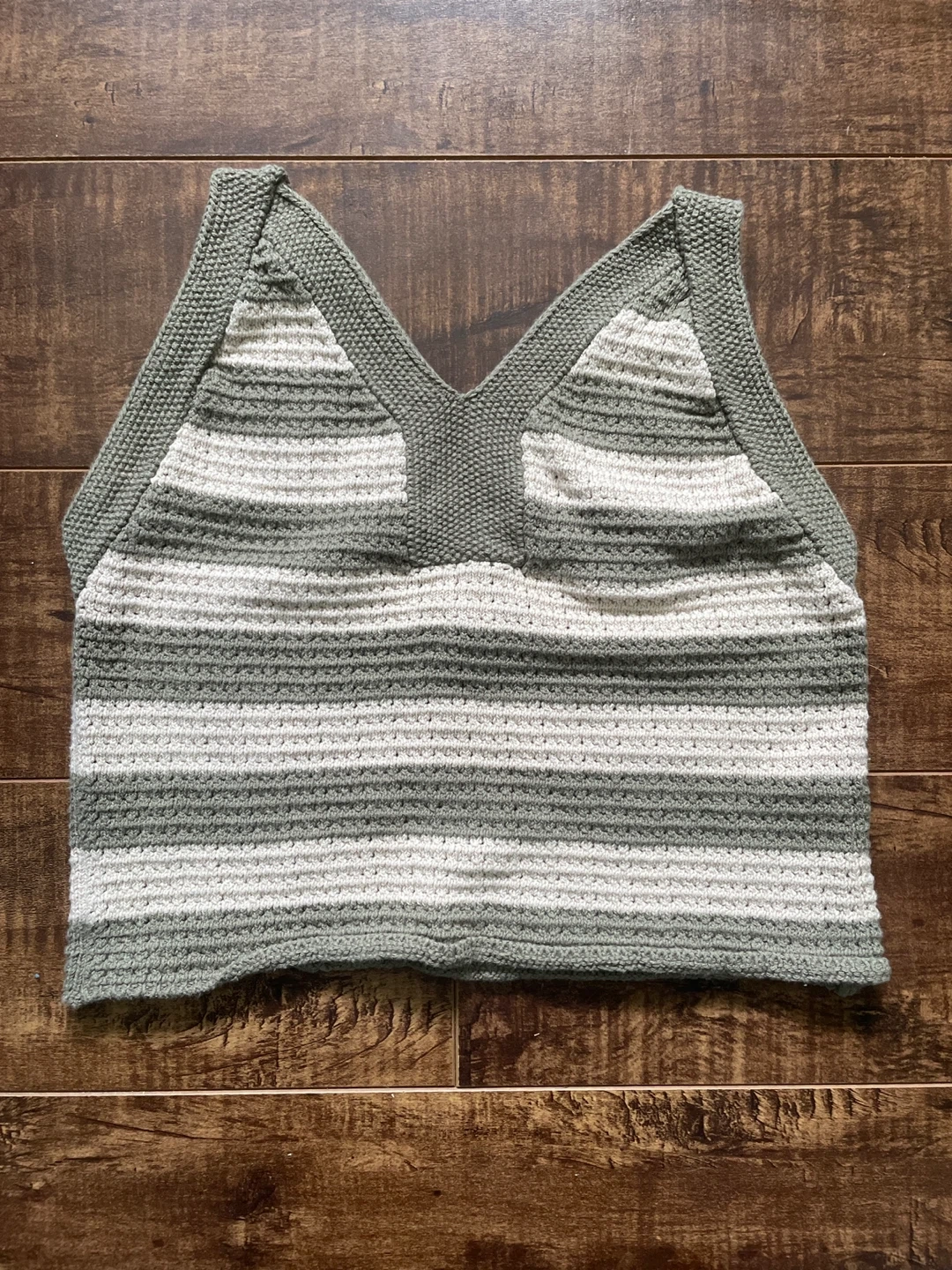 Here's a cute striped knit tank top! It features a V-neck and a comfortable fit. Perfect for layering or wearing on its own during warmer weather