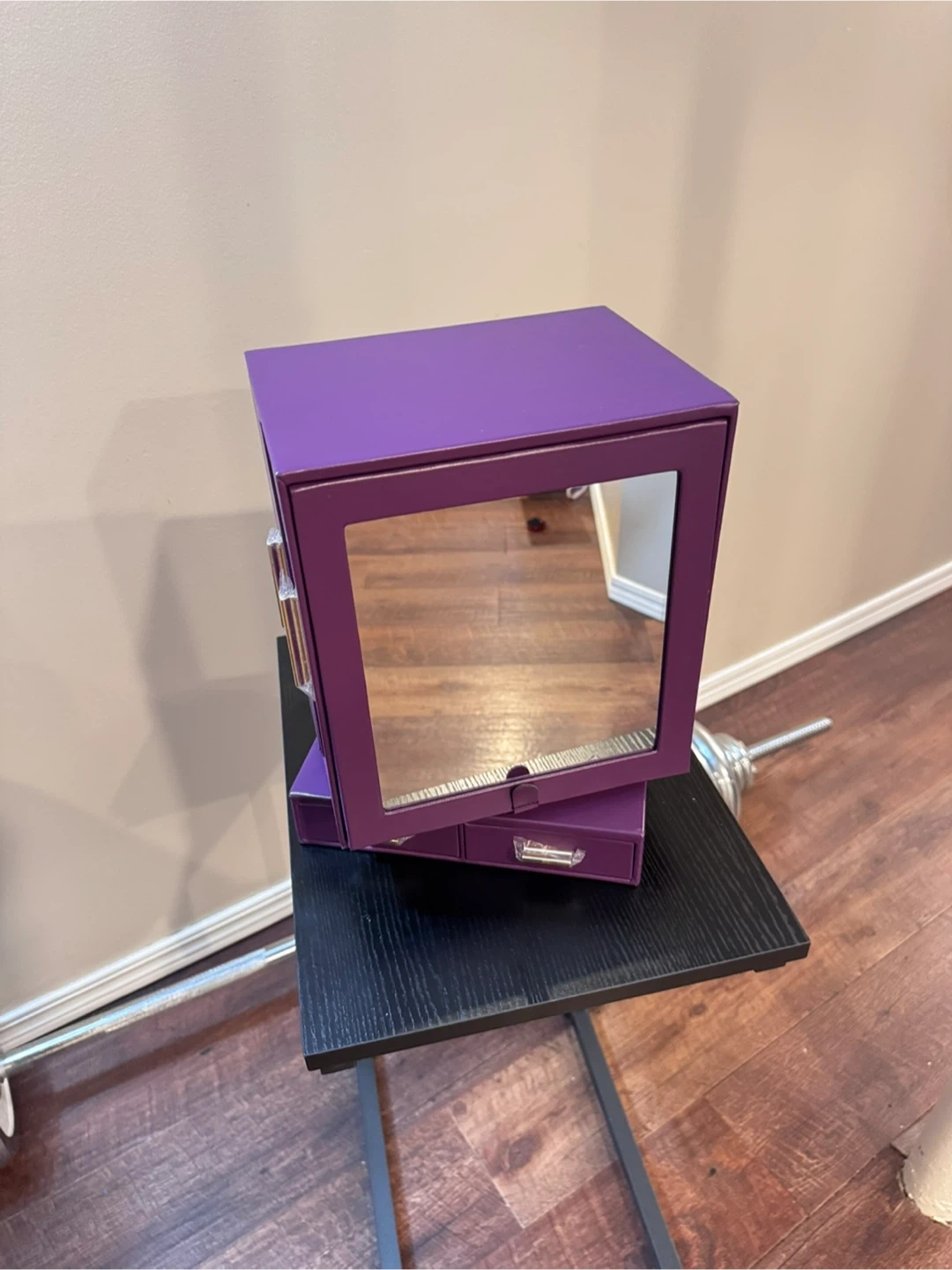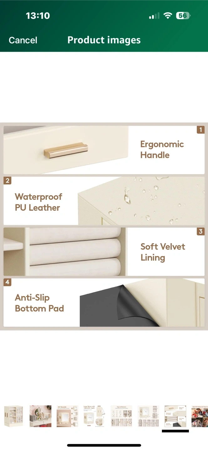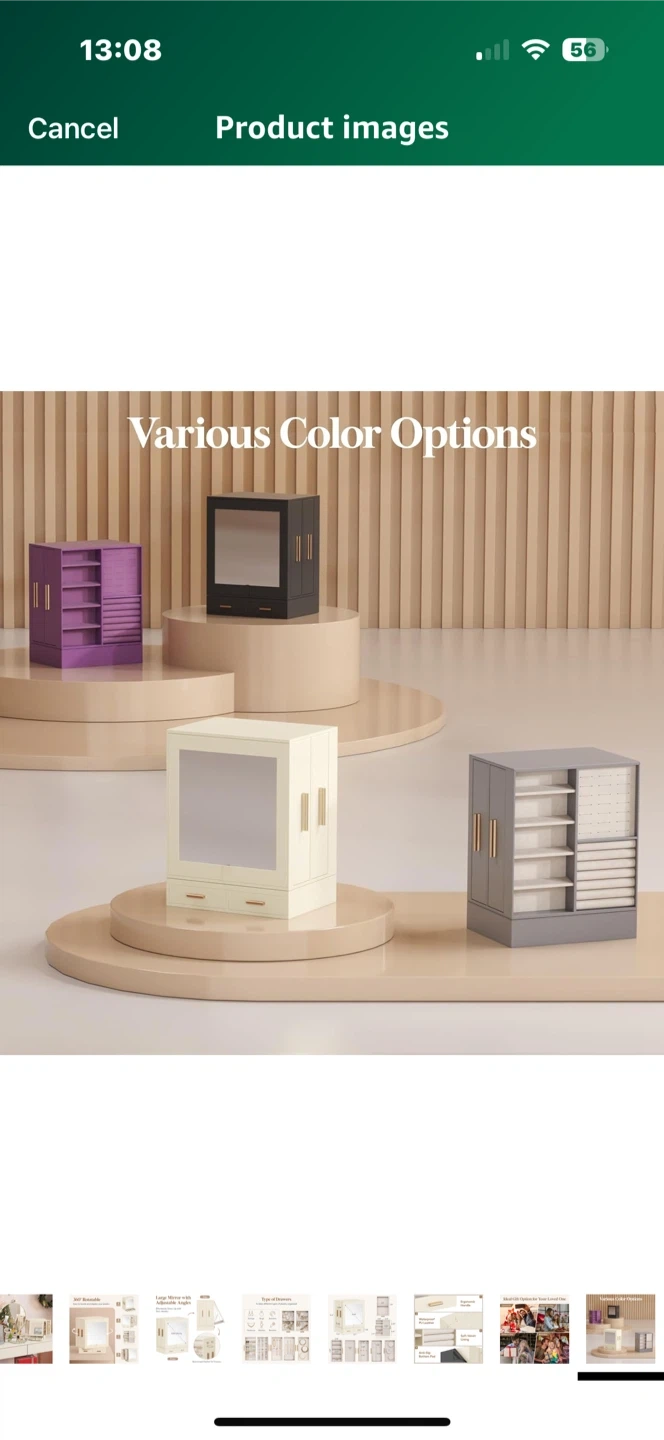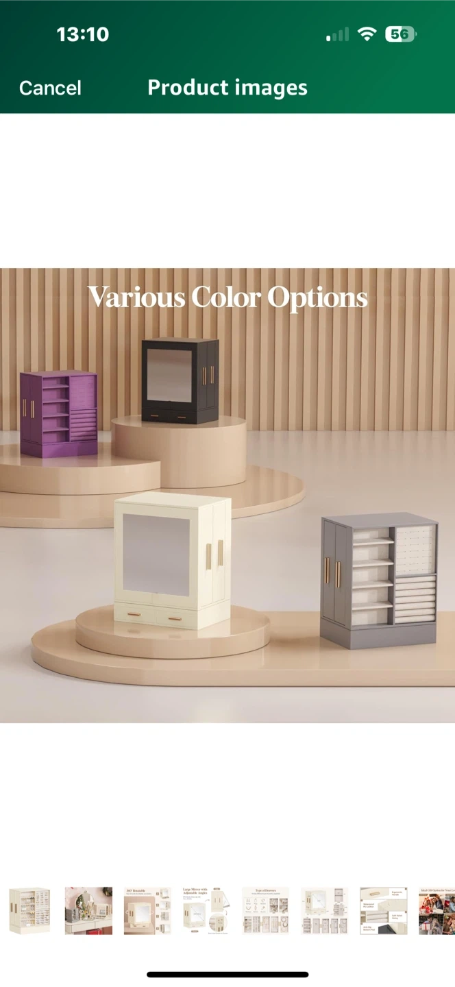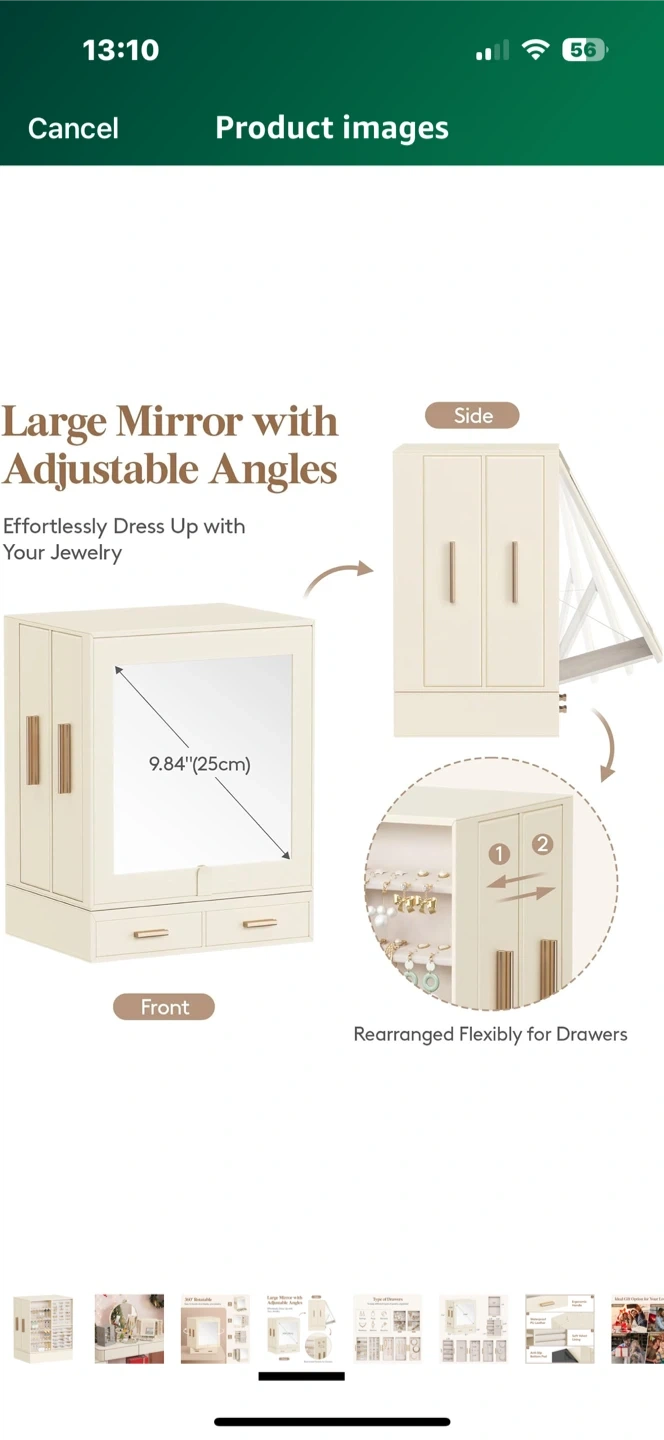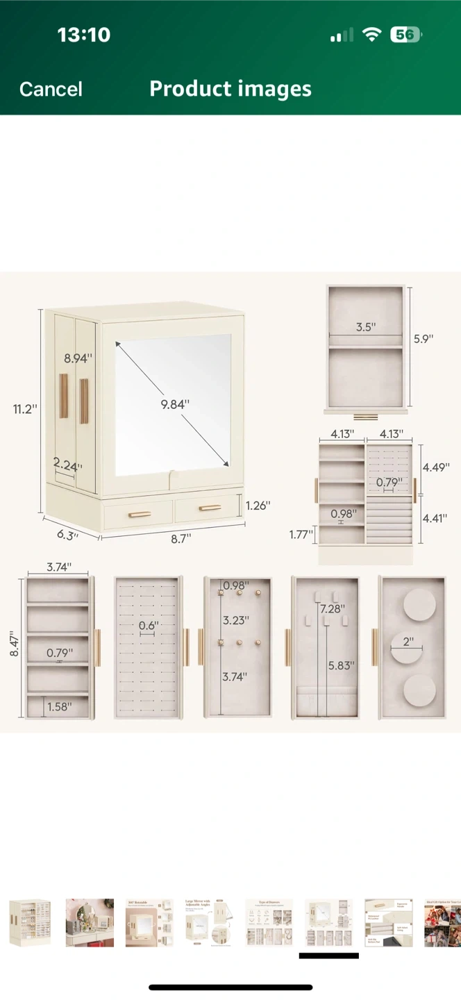 Looking to organize your jewelry? This Lifewit jewelry box is perfect! It features a large mirror with adjustable angles and drawers for flexible rearrangement. It's a 360° rotatable design, making it easy to locate and display your jewelry. The dimensions are 9.84" (25cm) for the mirror, and the box comes in a creamy white colour