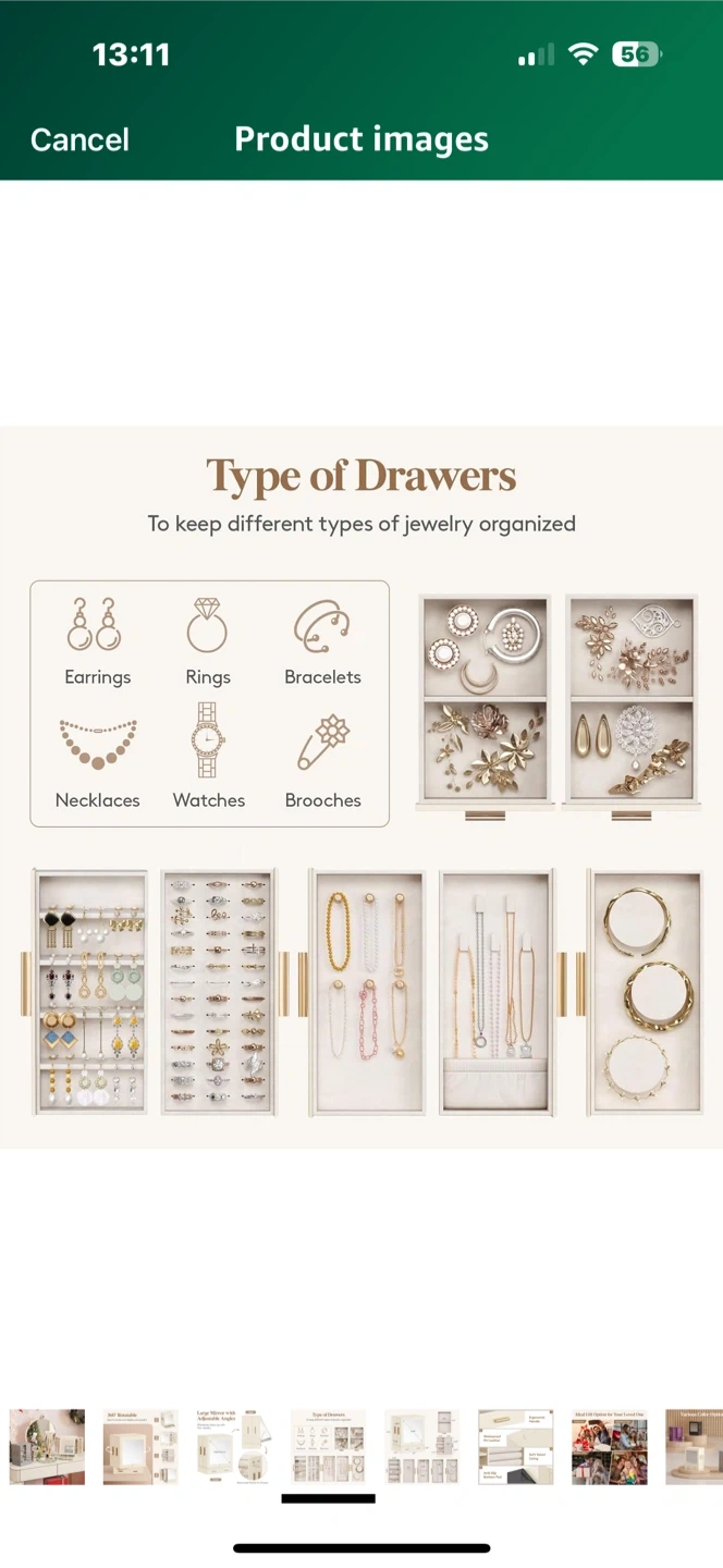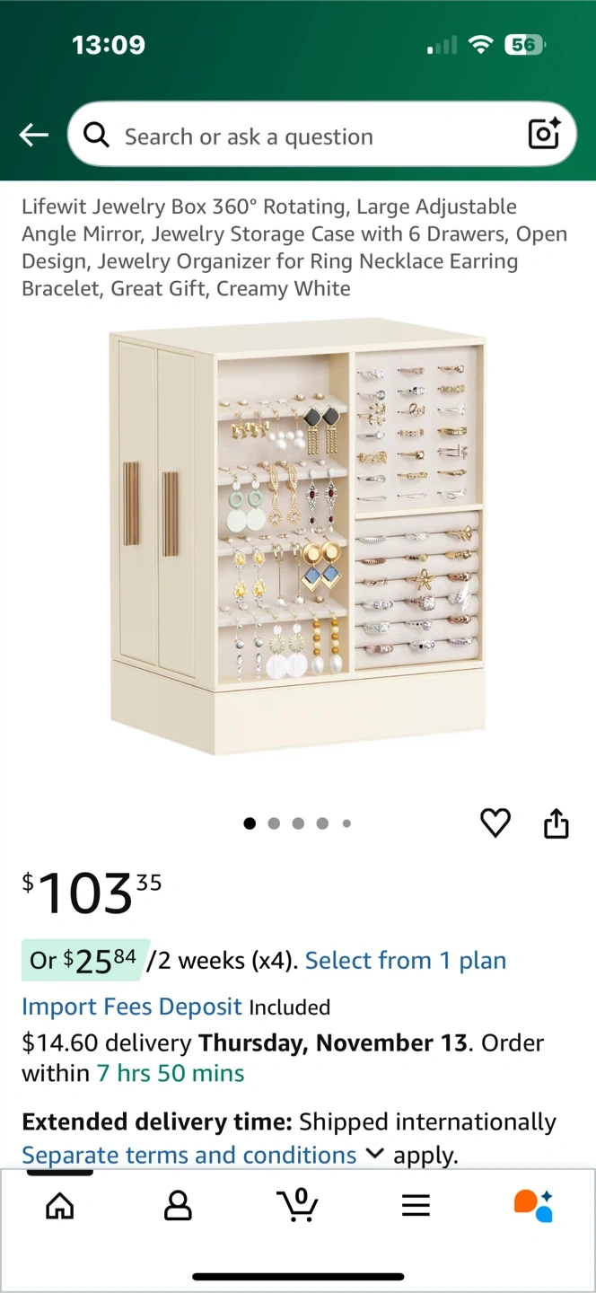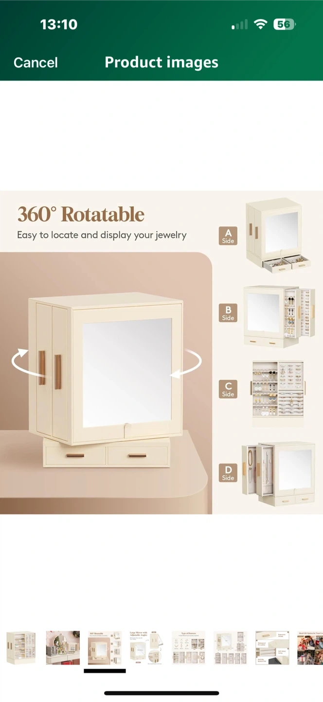 Looking to organize your jewelry? This Lifewit jewelry box is perfect! It features a large mirror with adjustable angles and drawers for flexible rearrangement. It's a 360° rotatable design, making it easy to locate and display your jewelry. The dimensions are 9.84" (25cm) for the mirror, and the box comes in a creamy white colour