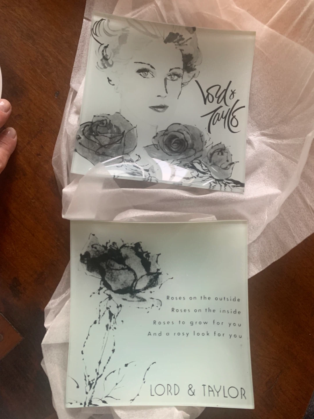 Selling a beautiful set of Lord & Taylor glass plates and a matching tea set. The plates feature elegant designs, including roses and portraits. Perfect for adding a touch of sophistication to your table setting!