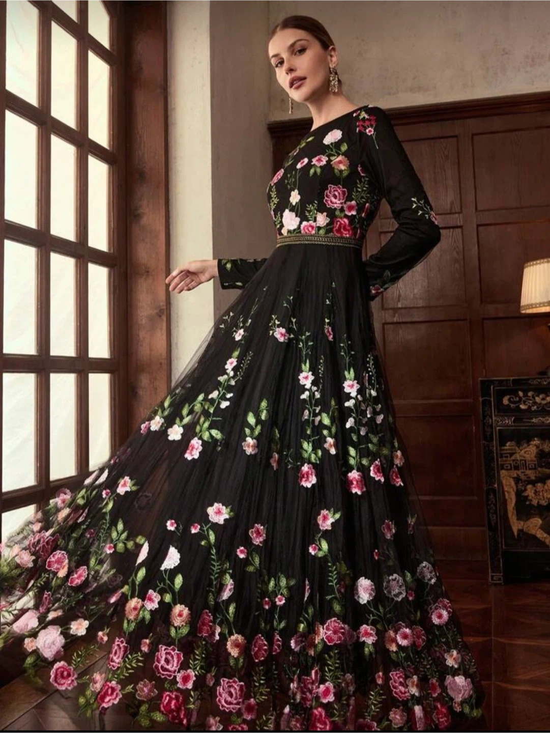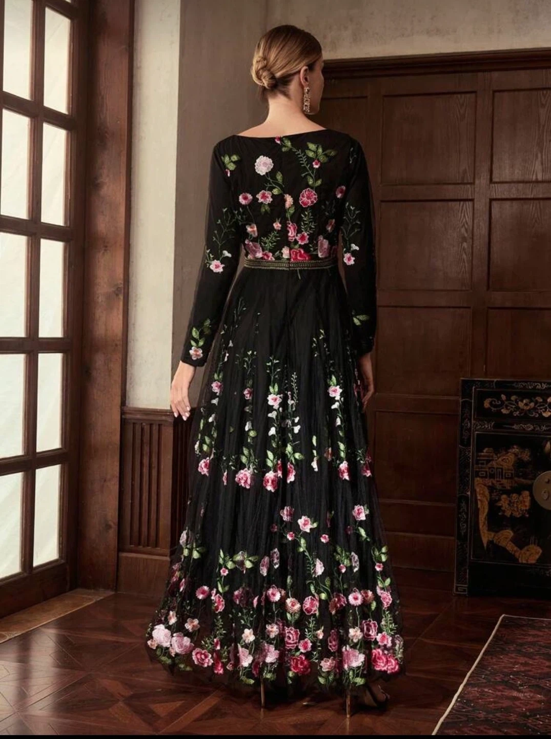 Beautiful black dress with delicate floral embroidery. It features long sleeves and a flowing skirt, perfect for a special occasion or a night out. The dress is in Size M-L.