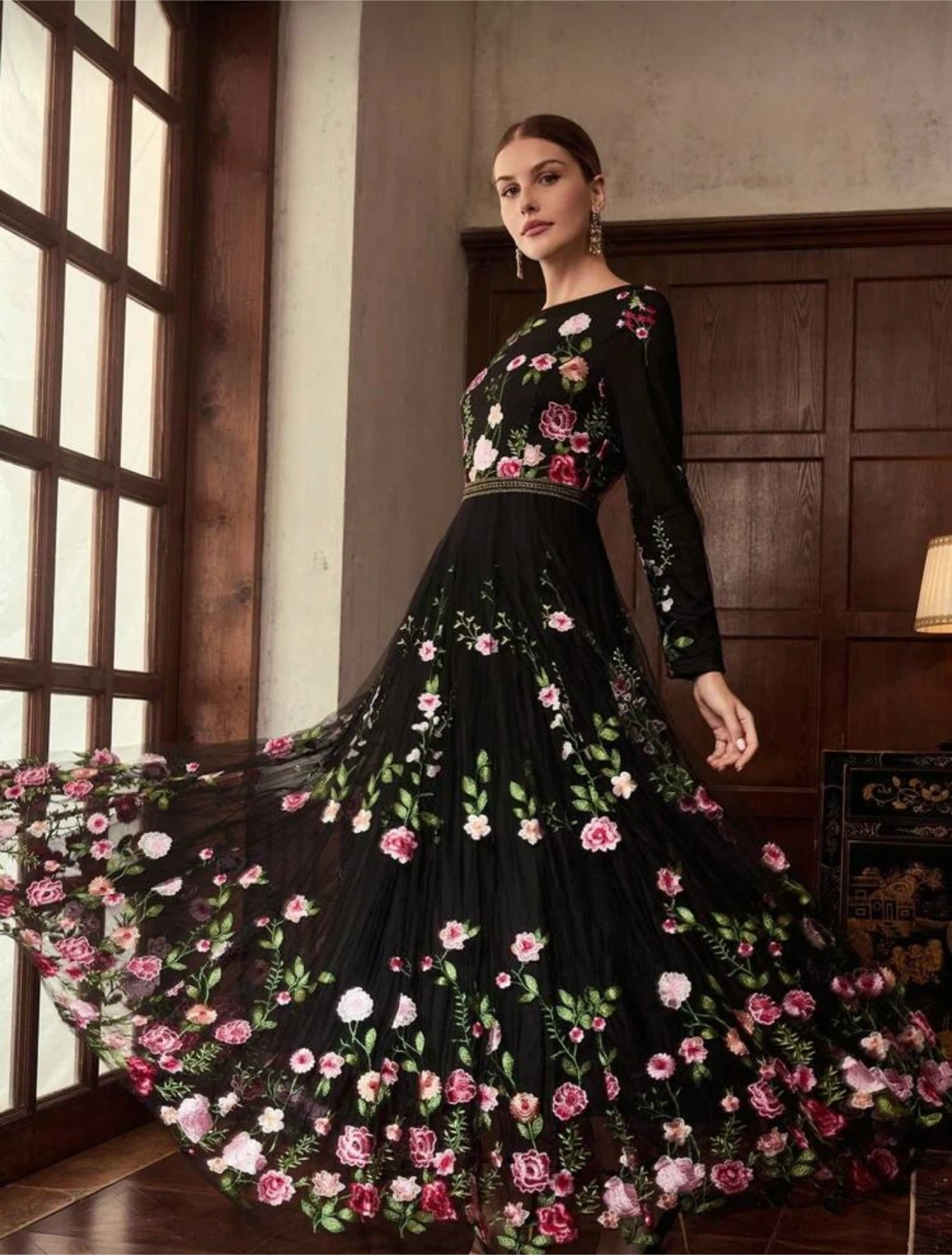 Black Floral Embroidered Long Sleeve Dress. Modest dress
