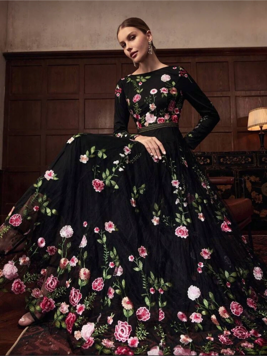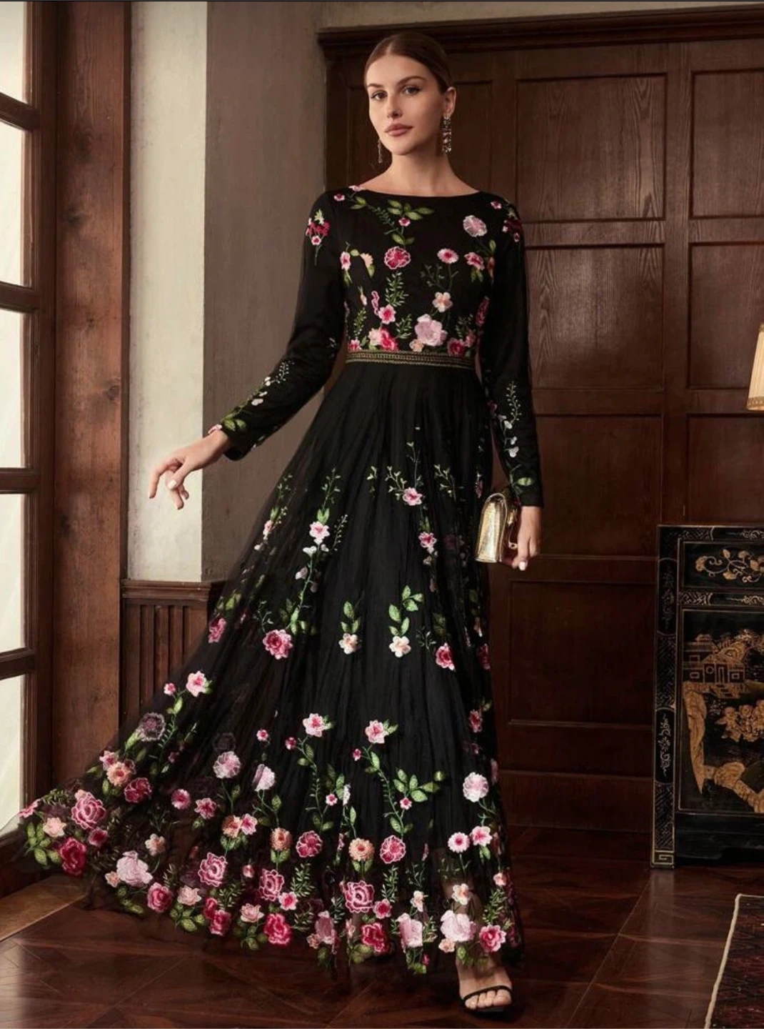 Black Floral Embroidered Long Sleeve Dress. Modest dress