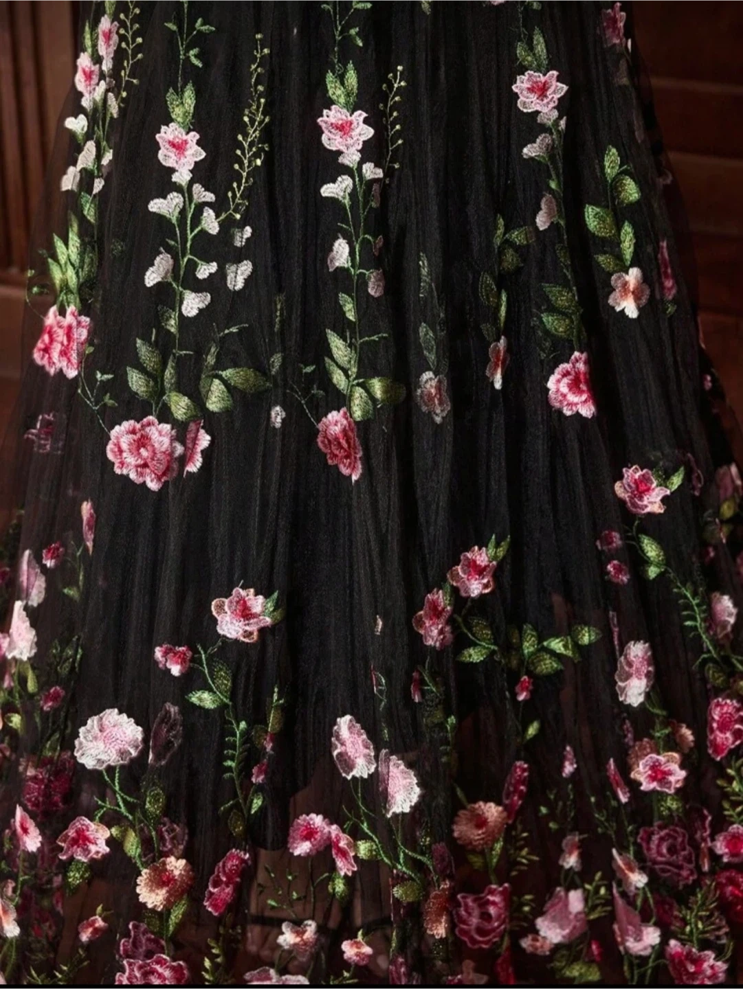 Beautiful black dress with delicate floral embroidery. It features long sleeves and a flowing skirt, perfect for a special occasion or a night out. The dress is in Size M-L.