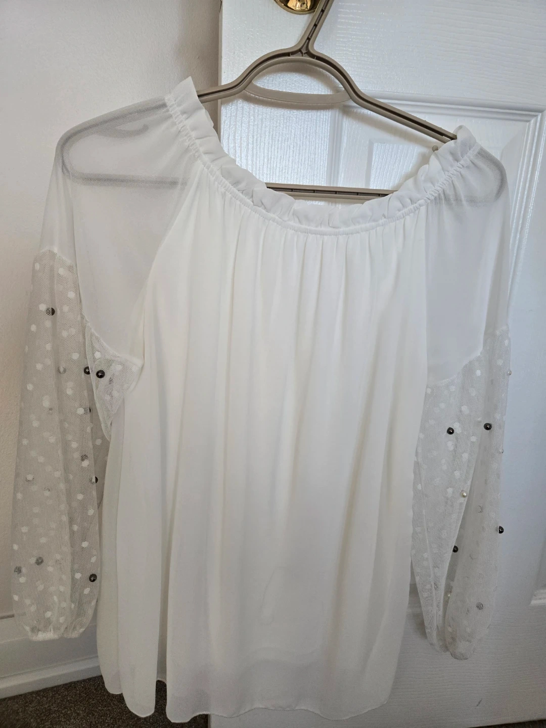 Here's a lovely white off-shoulder blouse! It features sheer sleeves with a polka dot pattern. Perfect for adding a touch of elegance to your outfit.