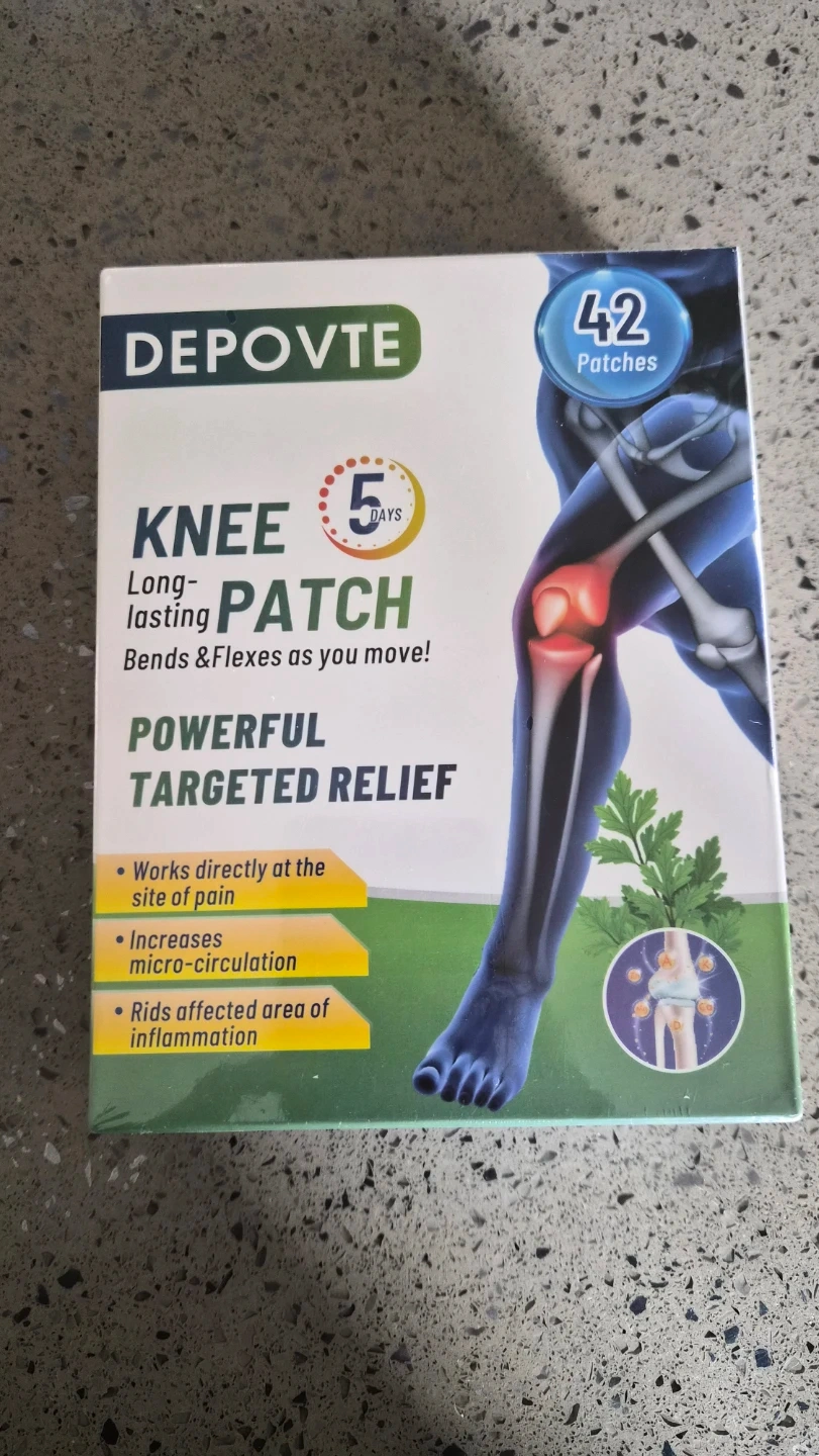 Selling a box of DEPOVTE Knee Patches. This box contains 42 patches designed for knee relief. The patches are intended to provide targeted relief and bend and flex as you move.