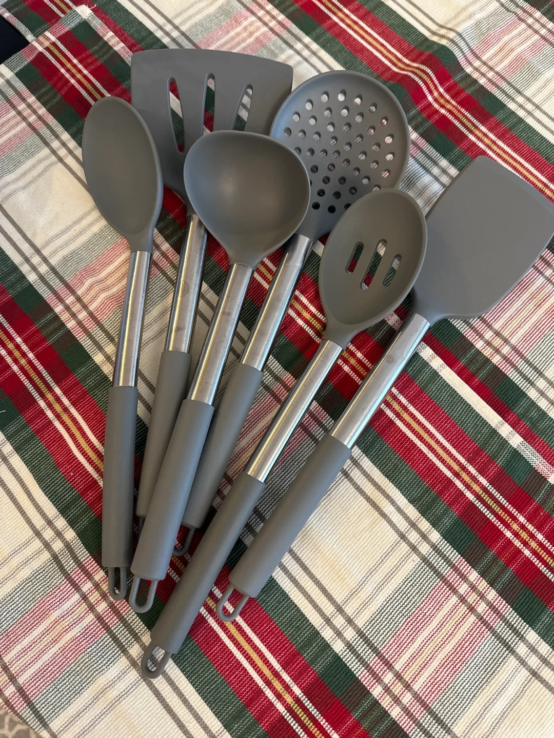 Selling a set of grey kitchen utensils. Includes a variety of spoons, spatulas, and a skimmer. Perfect for any kitchen!