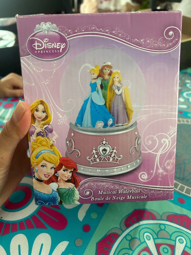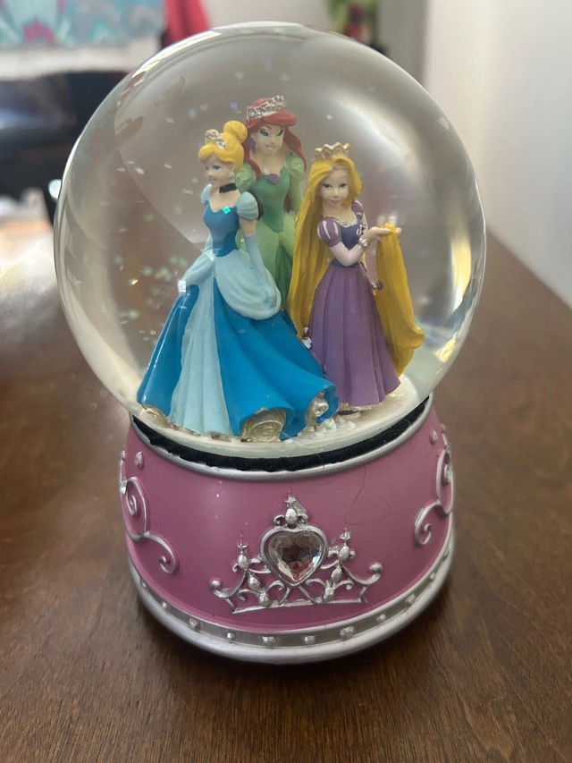 156This Disney Princess snow globe is a delightful musical waterball that plays "Twinkle Twinkle Little Star" when wound up. The globe features classic princesses like Cinderella, Ariel, and Rapunzel, making it a charming collectible for Disney enthusiasts. This item is like new and in very good condition and comes in the original packaging.