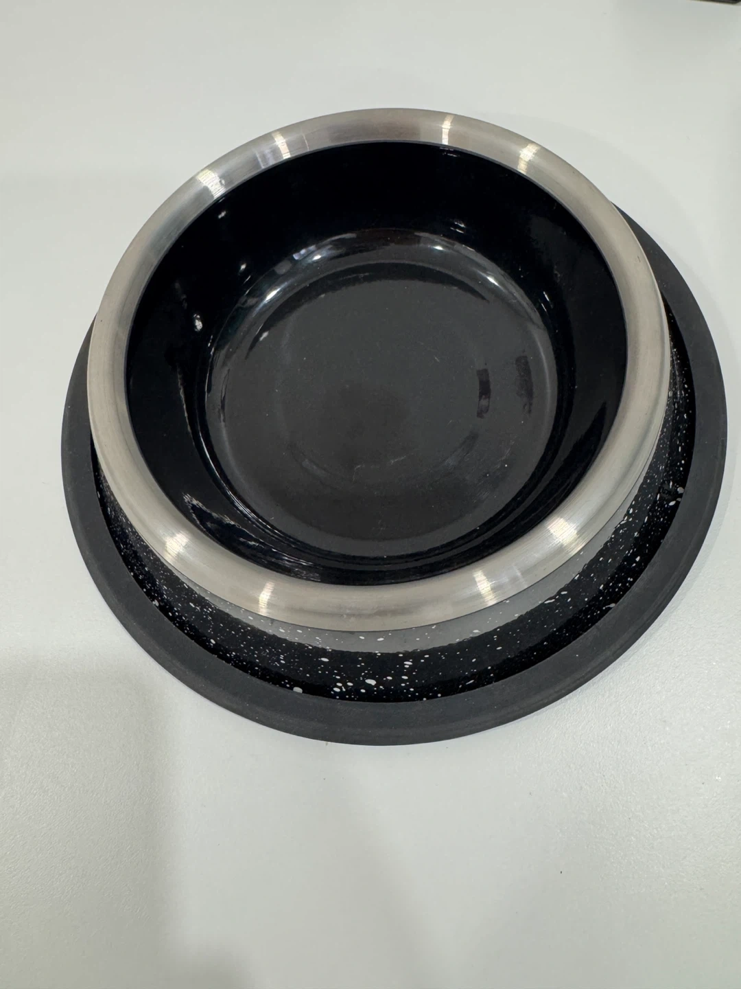 Selling a stainless steel dog bowl with a black exterior. It's in new condition never used and ready for a new furry friend! It has a speckled design and a rubber base to prevent slipping. It is 16 oz.