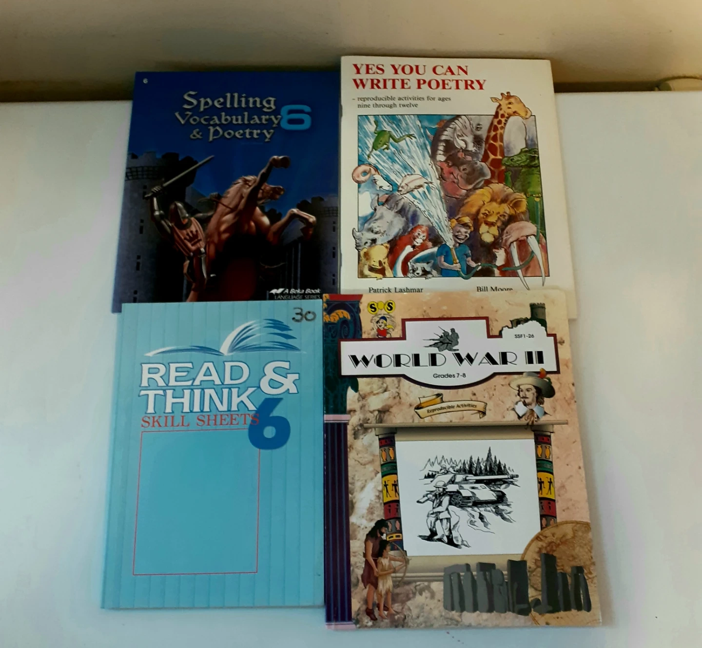 365- Spelling Vocabulary & Poetry 6 - Yes You Can Write Poetry (reproducible activities for ages nine through twelve) -Read & Think Skill Sheets 6 -World War II (Grades 7-8, Reproducible Activities) All are in a great condition. Sheppard and Bayview.