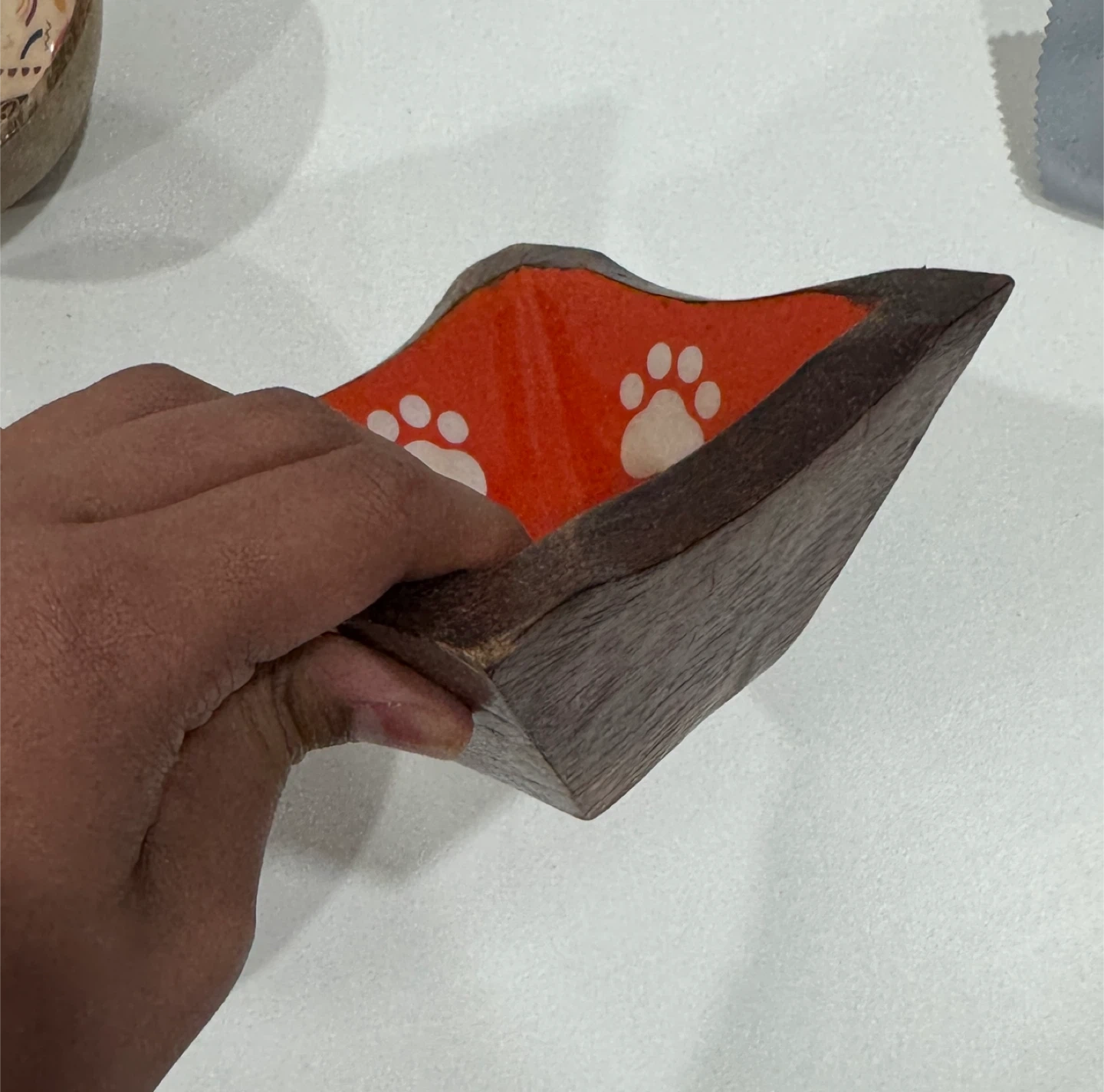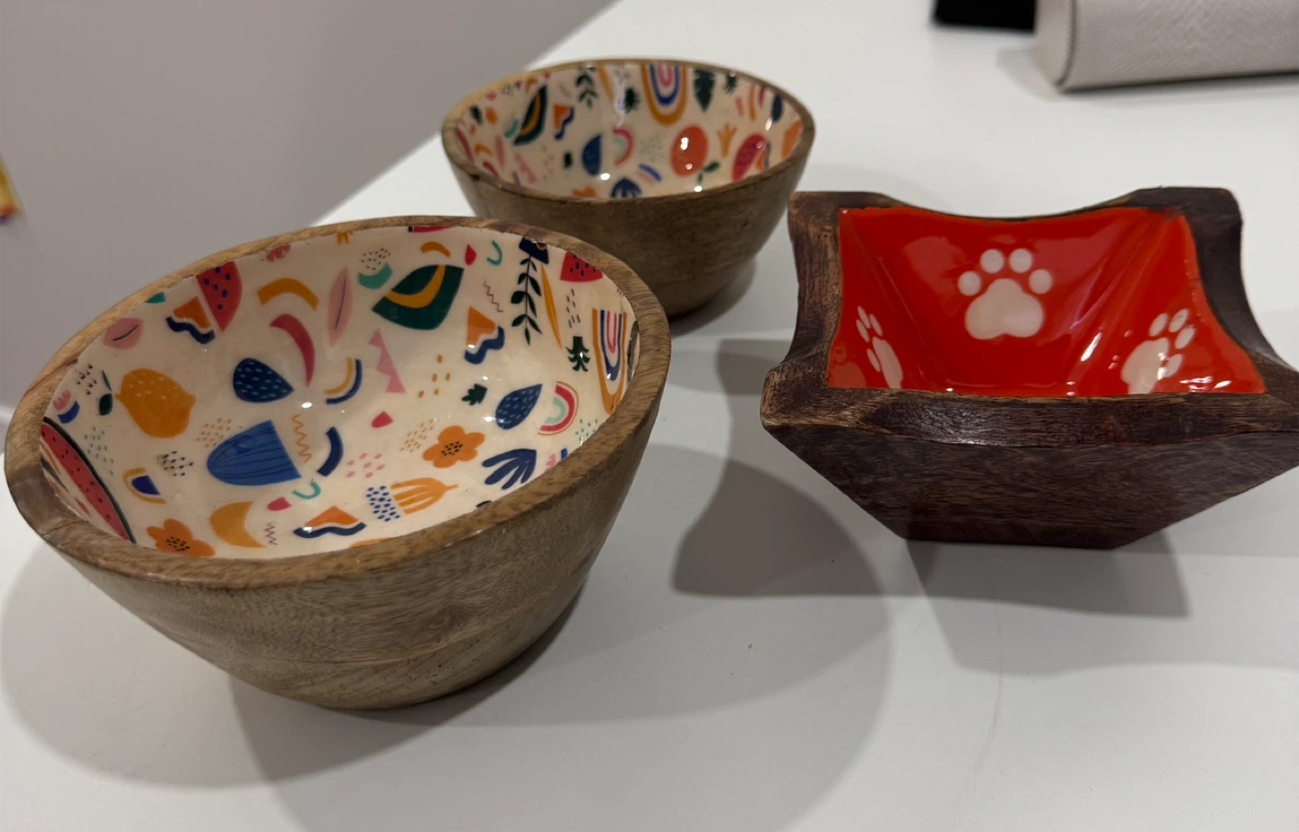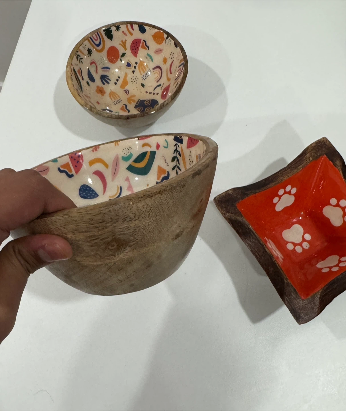 Selling a set of three wooden bowls! Two are round with colorful designs inside, and one is square with cute paw prints. They're bran new never used. Awesome quality your pet will LOVE.